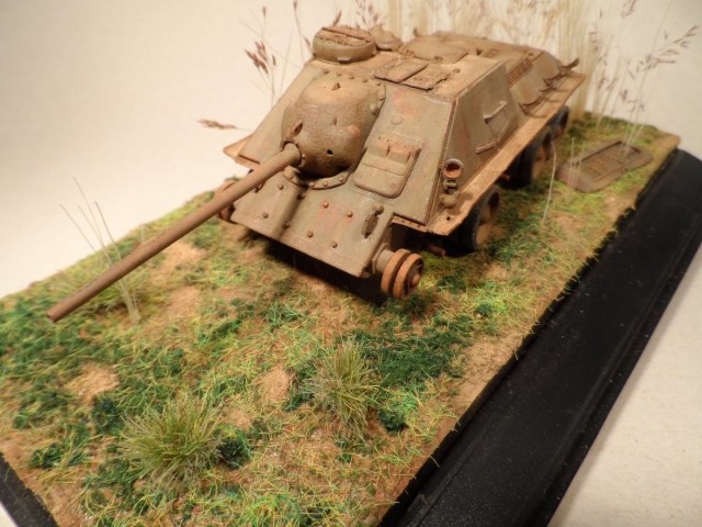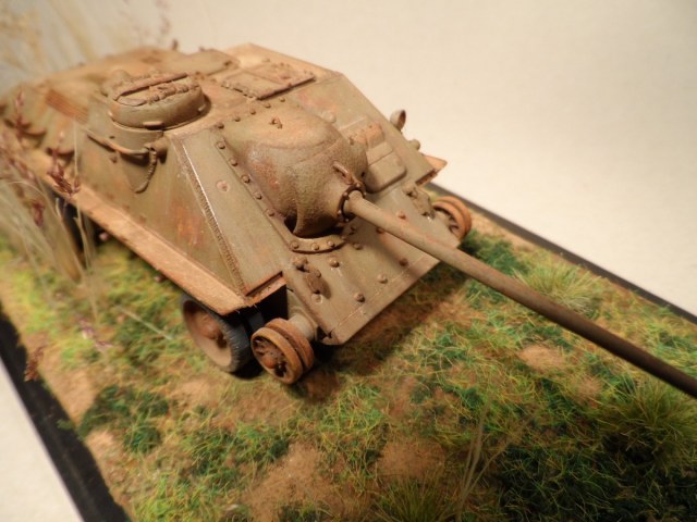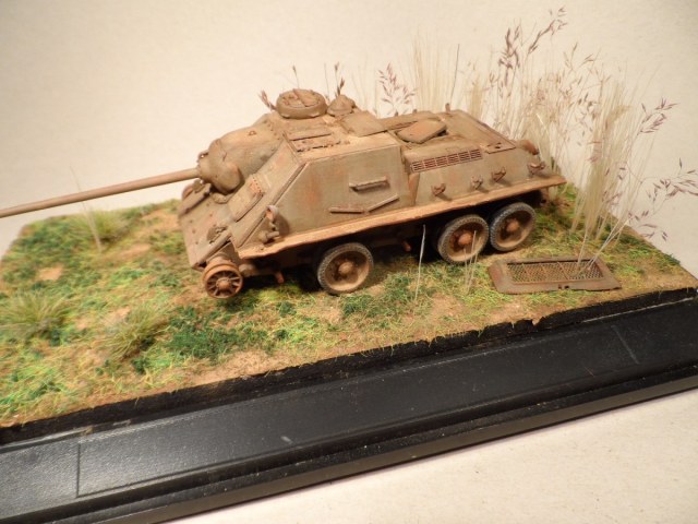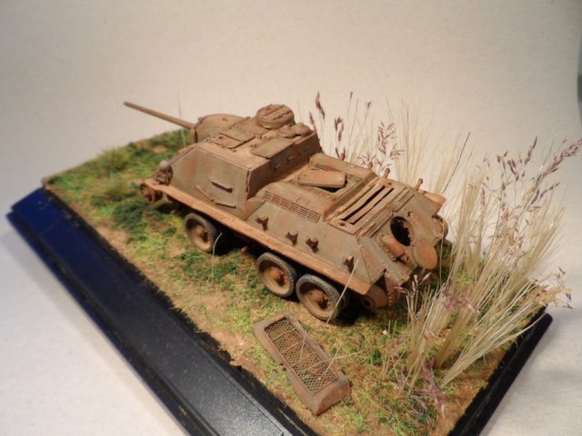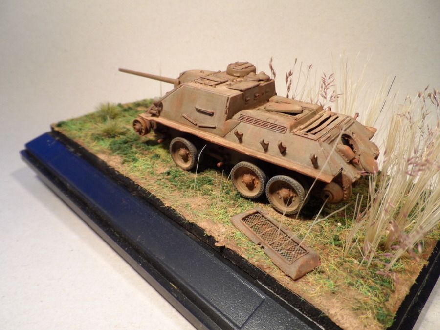 Очень симпатично получилось, особенно с учетом 72 масштаба. Единственное, при таком долгом стоянии (судя по ржавчине) машина должна была немного погрузится в землю. Ну а про траву уже сказали. Правда можно считать это зарослями конопли))))