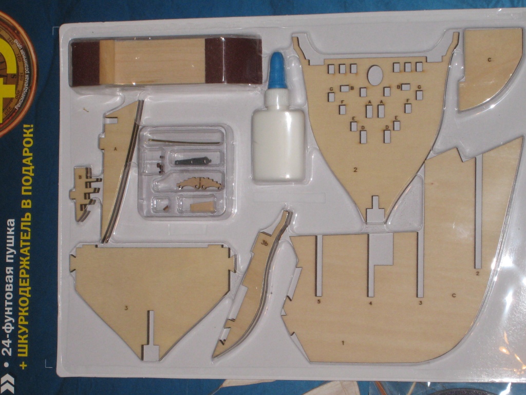 В компекте номера: комплект деталей, буклет с информацией, постер и DWD-диск и информацией по кораблю. Бонусом идет довольно-таки неплохой шкурник и клей ПВА