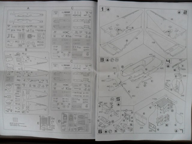 Теперь по набору. В кортонной коробке находится 5 литников (один из которых прозрачный), инструкция на 7 страницах, цветная вкладка с указаниями по окраске, листик с декалями, маленькая плата травления и еще какая-то деталь в пакете с декалями, пока что не зная для чего она. В общем и целом набор произвоит неплохое впечатление. На деталях хватает облоя и утяжин, но они не критичны, все вполне устранимо. Данный кит унифицирован и позволяет собрать самолеты различных модификаций, вопрос остается только за декалями. Изюминкой именно этого набора является возможность поставить на бомбардировщик стрелковую установку ВУБ-1 конструкции Топорова.