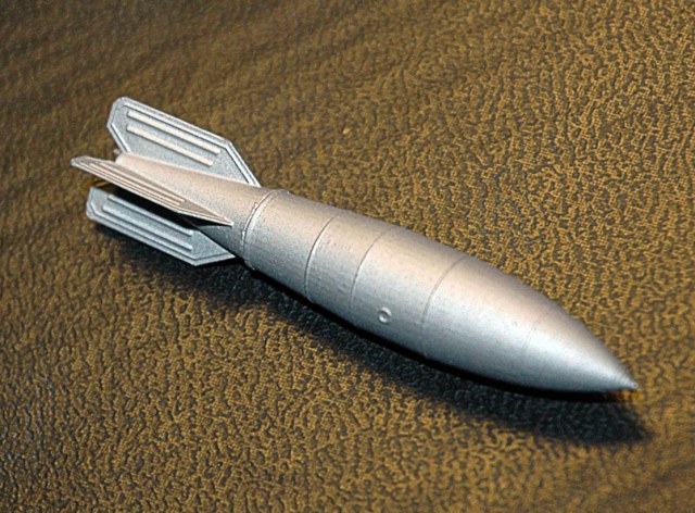 В прозрачном пакете находится буклетик с описанием и две отливки: с носовой и хвостовой частью боеприпаса. Набор комплектуется одной бомбой в виду того, что в штатном режиме более одной штуки на самолет не вешалось.