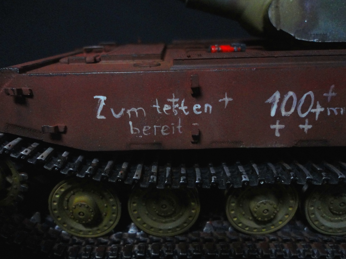 Надписи неаккуратные намеренно, для показания того, что они наносились в спешке, по внезапно пришедшему приказу. По легенде танк, а точнее его корпус, долго простоял в ангаре, пока не пришла башня и прочее, затем танк был отправлен на испытания. Смывка от AK interactive, пигмент ганметалл от MiGа.