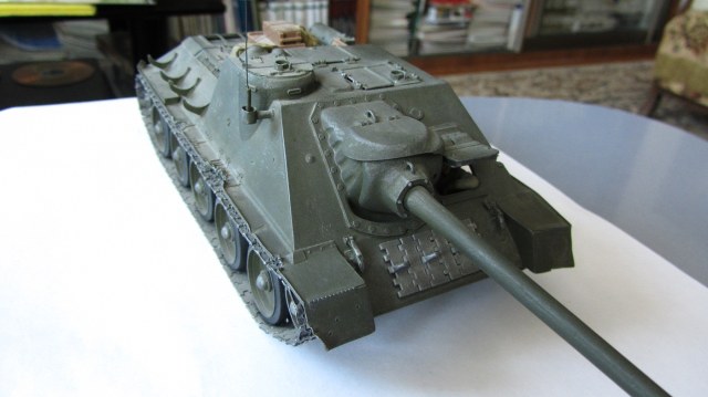 Обещал выложить свои модели многолетней давности. Вот модель СУ-100, построенная в 1996 году, то есть модели более 16 лет. Гусеници через год после постройки, то есть в 1997 году были заменены на макетовские. У первых тридцатьчетверок и СУ-100 была очень жесткая полиэтиленовая гусеница серебристлого цвета.