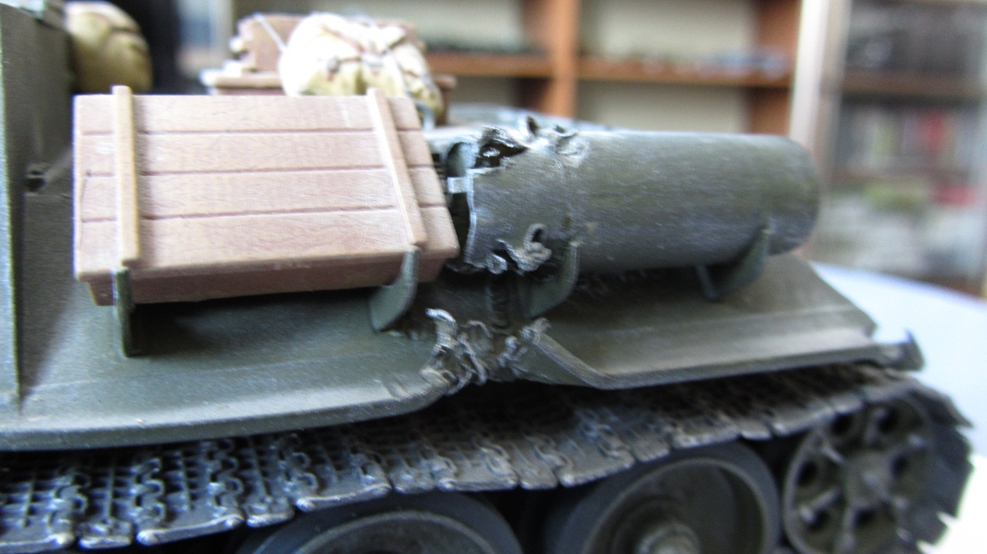 Из доработок-на нижнем лобовом листе выполнен лючок для доступа к правому неправляющему колесу, который затруднен из-за массивного казенника орудия. Была претензия на имитацию скоб крепления тента на правой надгусеничной полке - какие то металлические плоские скобки подарили электронщики из дворца культуры, который возглавлял тогда мой отец. Помню все было лень делать и вышел из положения сымитировав повреждение надгусеничной полки осколком снаряда или бомбы (повреждения выполнил выжигателем).