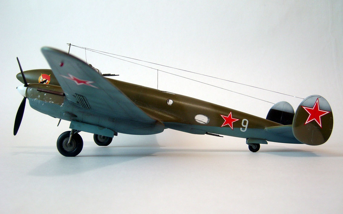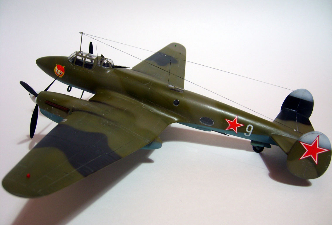 Всех приветствую!Хочу представить законченный долгострой-Пе-2 от МРМ в 48-м масштабе.Описывать качество модели не вижу смысла,так как уже много говорилось о низкопробности этого набора.При сборке переделывалось(перепиливалось,заменялось и т д.) абсолютно всё,от самых мелких до крупных деталей.Пожалуй,стоит тезисно описать основные моменты стройки...Кабина пилота и штурмана: приборные доски,прицел,панели и ручки управления,кресло пилота,ремни,проводка,патронные ящики,пулеметная лента,наступательные ШКАС(Вектор) и УБ(переделанный Арк).Кабина стрелка:Радиостанция,кресло,крепление для УБ,тяги к рулям.Нижняя часть правой консоли крыла-из листового пластика(родная лопнула при попытках выпрямления).Переделаны двигатели,левый подкос шасси,стойки шасси. Подвесы для бомб,РПК,щитки,мачта антенны,АНО и т.д. По всей модели заново нанесена расшивка и частично клёп. Красилось все акрилом от Тамии и Акан.Декали от разных наборов.Привязки к прототипу нет... С момента начала постройки прошел почти год и,признаться честно,эта модель меня изрядно вымотала,но этот пикировщик мне нравился с детства.И большому сожалению альтернативы в 48-м этому самолету нет(еще,правда,есть HiPM,но отзывам -дрова,не лучше МРМ).В любом случае,модель закончена и готова к просмотру! P.S. На момент фотосессии,в силу отсутствия тонких игл,не поставил ствол ШКАСа слева и никак не смог победить годовалую пыль на остеклении. Приятного просмотра!