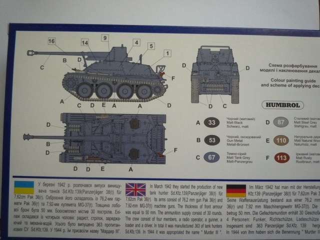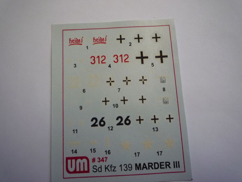 Доброго времени суток,уважаемые каропчане.Представляю вам обзор самоходной установки мардер3 от украинского производителя юнимоделс.В коробке находятся 4 литника,платка травла и лист с декалями.Качество набора приемлемое,встречается небольшие утяжины и мелкий облой,но в общем все не так критично.Платка травления жестковата,так-что ее рекомендуется отжечь на огнем.Декали неплохие ,но очень любят разваливаться прямо в руках,а вот стыкуемость совсем не ахти.Тем,кто будет собирать сей кит,рекоменую обратить внимание на стенки боевой рубки и на лобовую деталь.Вобщем модель стоит своих денег(350 рублей),однако в нем есть огромадное поле для доработок.Приятного просмотра