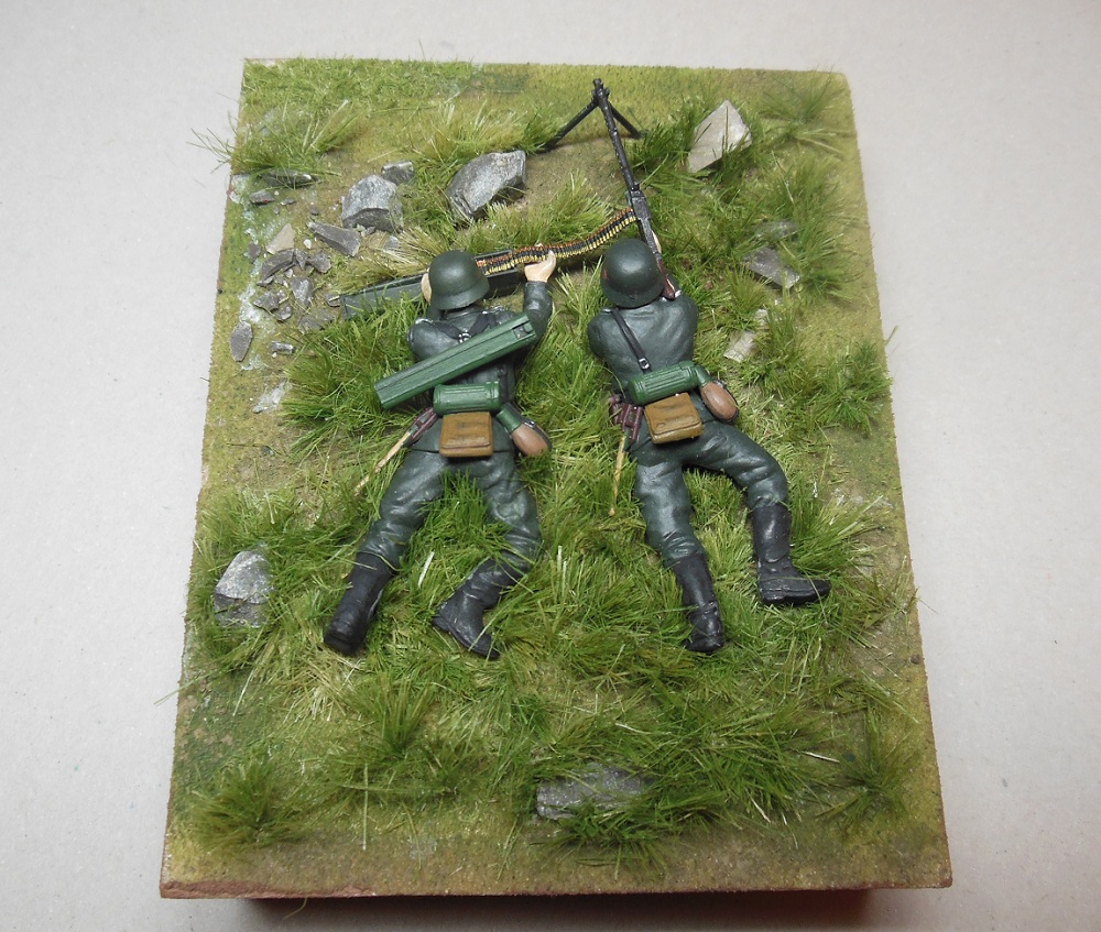 Понравилась подставка, террэйн удался) а вот фигурки подкачали. Судя по всему немцы не живые уже, цвет лиц такой) ствол мг34 не рассверлен, эквип не пойми как весит, Дэкали серебрятся, фигурки покрашены монотонно без рельефа, ну и слишком чистые они у Вас, сапоги видимо им тут выдали по месту. Автору хороших работ в будущем