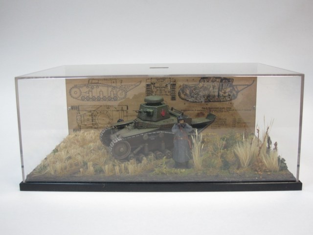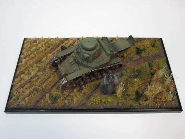 Странное дело, первый раз вижу, чтобы оценки у работы были ниже, чем она этого заслуживает. Понравилось аккуратное исполнение, танк и ландшафт. Люди не подходят по униформе к началу 30-х. Над фигурами надо работать - они блестят и их уровень значительно ниже.
