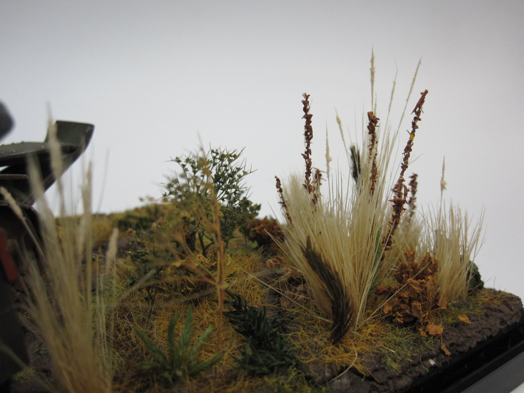 Для диорамы использовались след. материалы: грунт (шпатлевка по дереву, присыпка гравий фирмы Noch, акрил tamiya, кофе, пастельные мелки), трава и растительность (трава Noch, кисть, опилки разной фракции, гербарий из разных растений, акрил tamiya), клей ПВА Д3, лаки mr hobby.