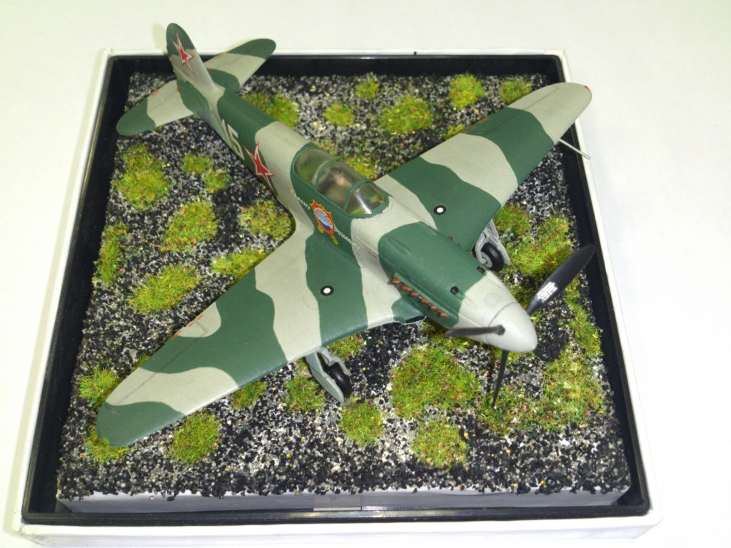 а это мое очередное чудо. друзья подарили на ДР. собирал и красил на работе в режиме "только бы начальник не зашел" :) кисти,акрил Звезда, лак из балона. Что именно мной двигало,когда я решил покрыть модель лаком не знаю, но это что-то точно было от лукавого. как итог - замутненное стекло кабины((((жаль ,ведь над пилотом и кабиной я попыхтел. подставку сделал ради прикола. трава шла вместе с подарком, а грунт - зверски распотрашенный фильтр Барьер.