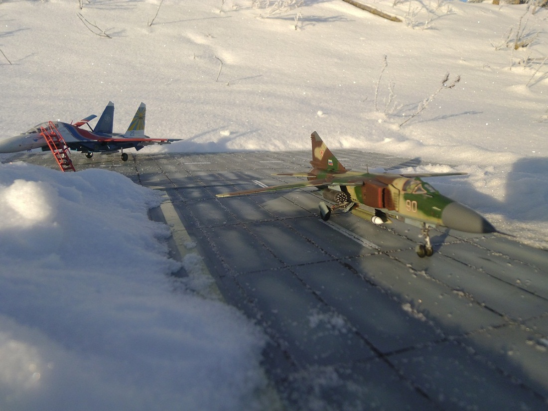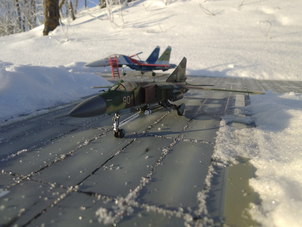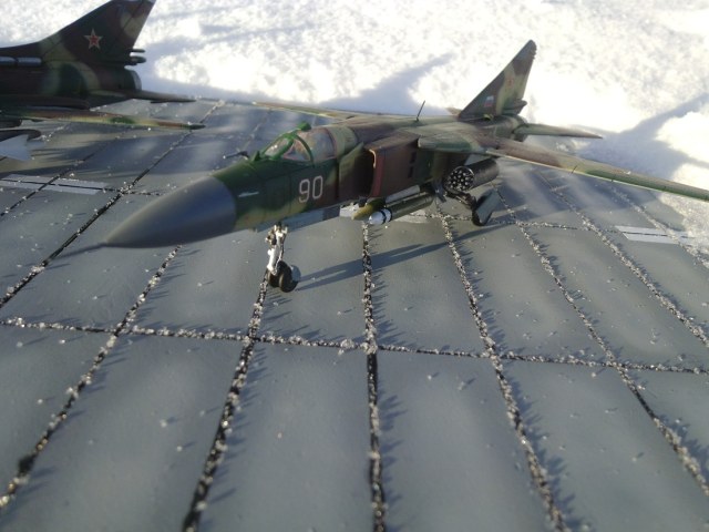 Все-таки МиГ-23 – это истребитель. МиГ-27 – совсем другое дело, штурмовик. Интересно, но никто не выставлял пока МиГ-23 в серебристой окраске на каропке. Не сочтите за саморекламу, я еще никогда его не выставлял свой МиГ-23, серебристый тоже неплохо. Хотел показать, как может выглядеть серебристый.