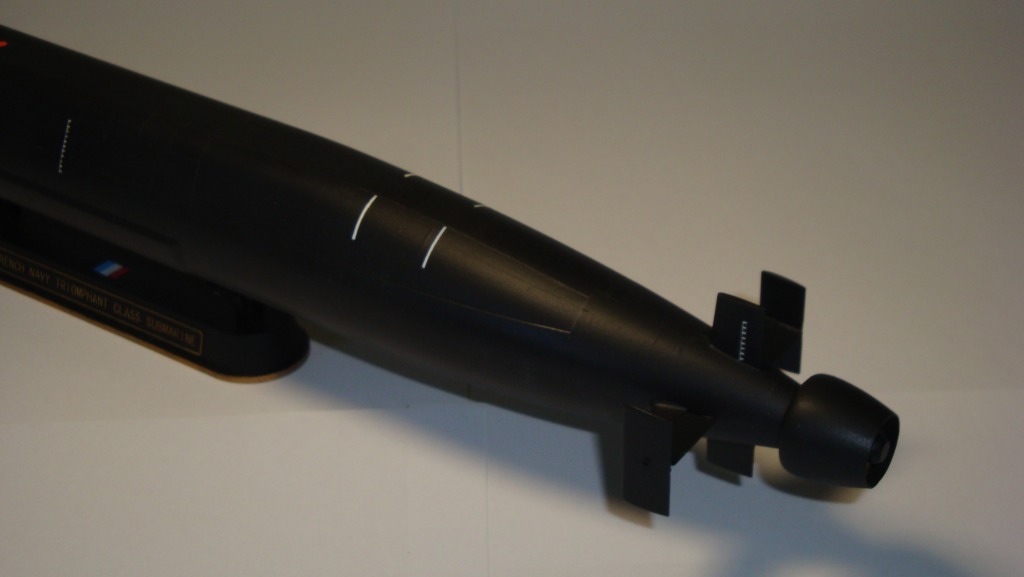 Особых проблем при сборке не возникло, если не считать "ступеньки", образовавшейся при стыковке половинок корпуса, но шпатлевка и тамиевская наждачка сделали своё дело, небольшие утяжины в разных частях корпуса так же особой проблемы не составили. Нижнюю часть вертикального руля немного сдвинул в сторону носовой части, иначе получалось по инструкции что нижняя и верхняя части не симметрично расположены. Доработал крышки ракетных шахт, основываясь на фото американок (вообще думал изначально сделать по образцу советских/российских стратегов, как сделал на своем Триомфане Данила 77, но в итоге решил что было бы неплохо сделать другой вариант, для сравнения так сказать), ВУ оставил изкоробочные с минимальными доработками. Травленный винт из набора мистическим образом исчез во время уборки, пришлось оставить пластиковый (как назло, уже в процессе нанесения декалей, винт был обнаружен во время очередной уборки, и был он зажат между плинтусом и полом, причем как он там мог оказаться так и не ясно). Декалей в наборе небыло вообще, сначала хотел использовать от Макетовского "Курска", но в итоге взял деки советских ВМФ от Бегемота, обрезав лишнее, белые вертикальные полосы наносил краской с помощью тамиевской малярной ленты, кстати нанесены они на разных лодках по-разному, я ориентировался на одно - единственное фото кормы именно "Le Vigilant" где они были (нашёл её на одном из забугорных форумов в ветке обсуждений французских вооруженных сил). При покраске использовал несколько оттенков чёрного (чёрный матовый акрил Хо-Ма, чёрный глянцевый акрил Хо-Ма, чёрный эмалевый номер 6 от Ревелла), в конце модель была покрыта матовым лаком. Вообще эта лодка вышла "дважды рождённой", изначально собирал я именно Триомфан, но когда лодка "сохла" ночью после покраски на кухне, на неё была пролита детская смесь, которую жена делала для сына, пришлось оттирать спиртом, получилось оттереть её только вместе с краской и лодка была отправлена на полку к недостроенным моделям в ожидании появления у меня желания её закончить. Просматривая в очередной раз инфу по этим лодкам, обратил внимание что у меня с "Бдительным" ("Le Vigilant") день рождения в один день, вот так и появилась идея сделать именно его. В процессе покраски немного поэкспериментировал с глянцевым и матовым лаком, пытаясь создать неравномерность окраски. Эта модель была последней, покрашенной кистью.