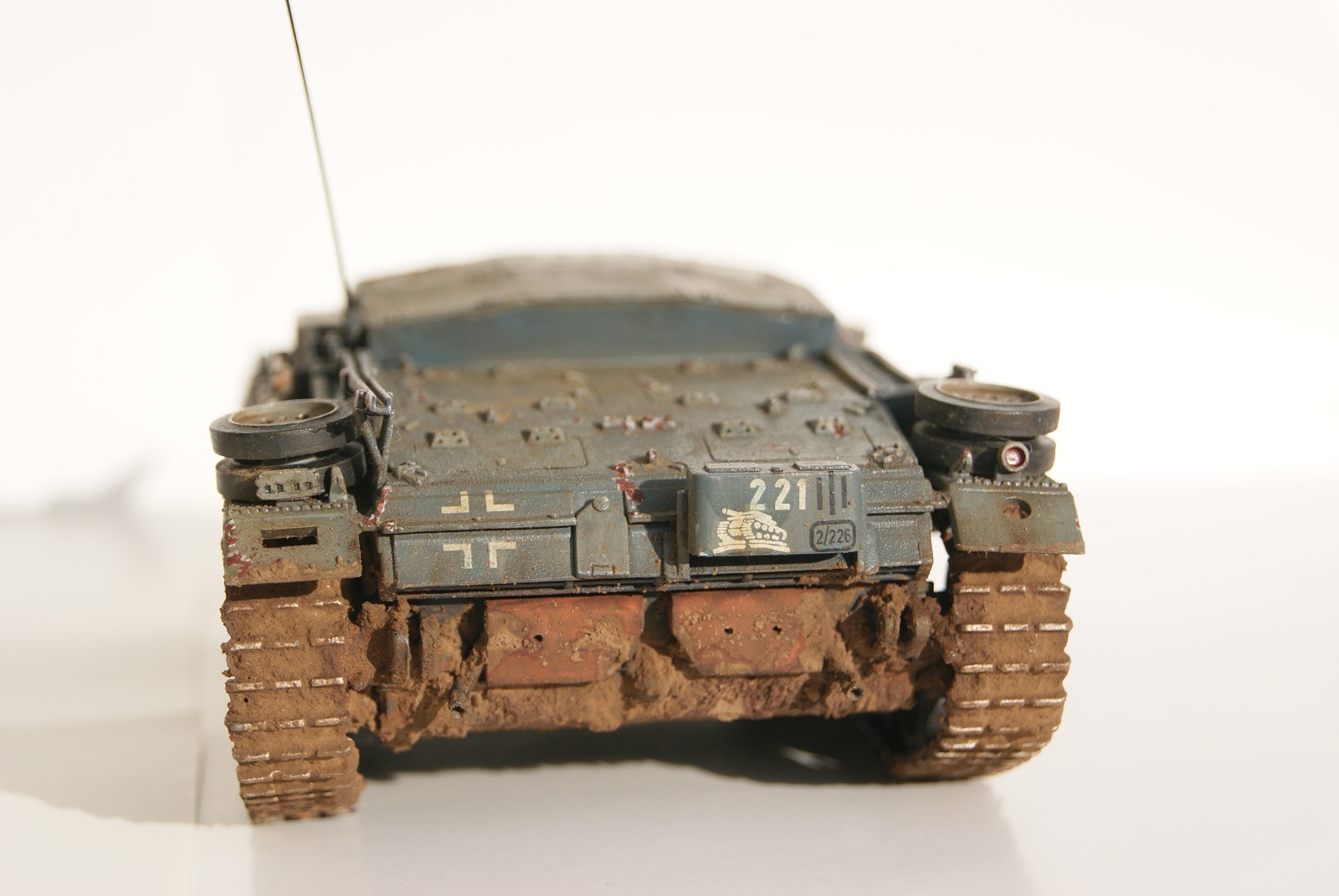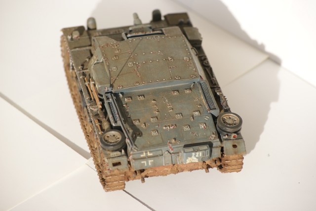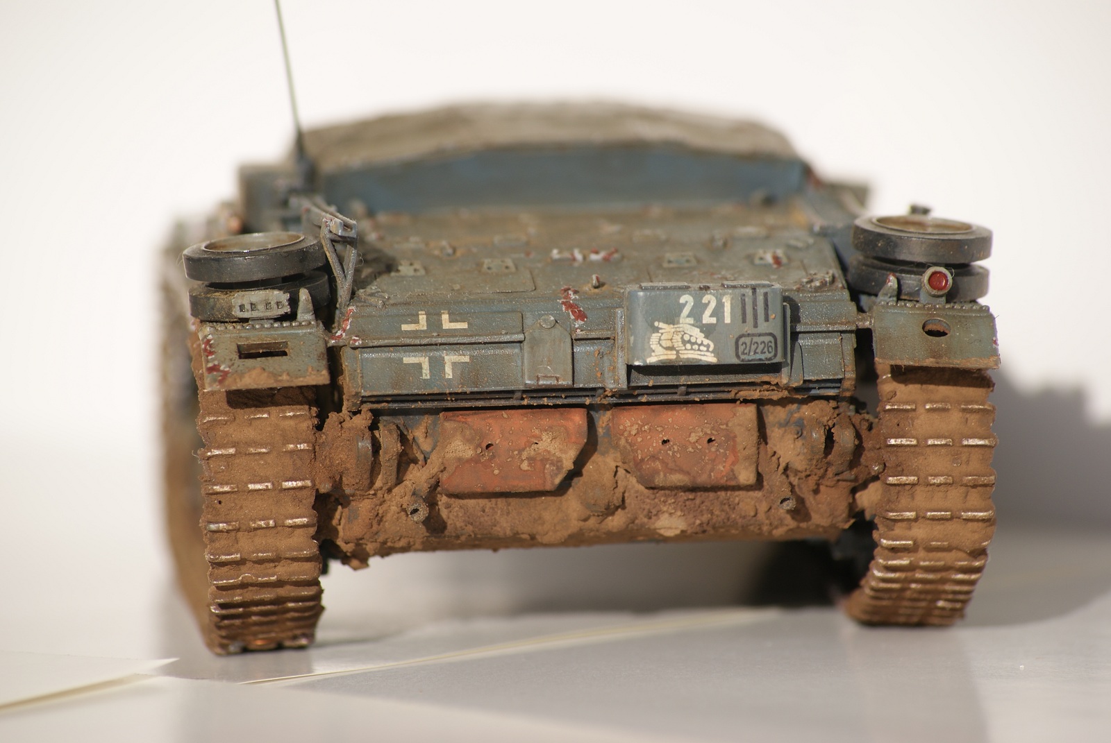 Красил аэрографом акрилом от тамии, фильтр и смывка - масло с уайтспиритом. Пыль - пастель. Грязь - сода + пастель.