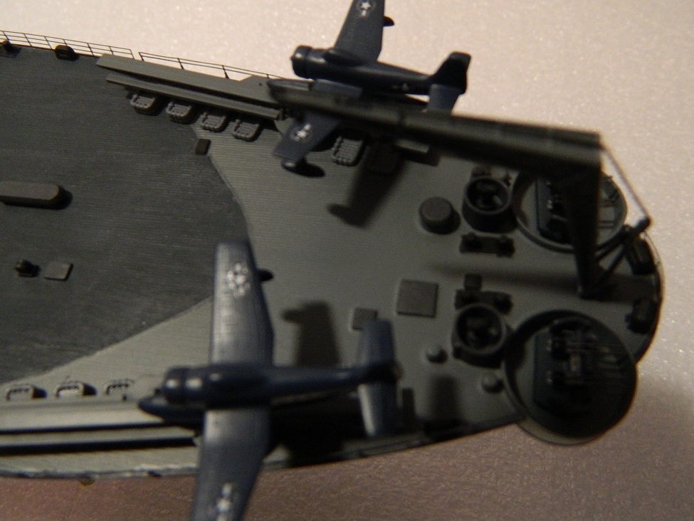 По неуспехам Капитаны уже всё сказали, (такелаж,антенны,самолеты,флаги,кран).Добавлю сюда нерассверленные стволы орудий ГК, "непобежденные" стыки палуб (фото 4-5) и щели между палубой и носовой и кормовой надстройкой . Отсутствует остекление, как класс ).