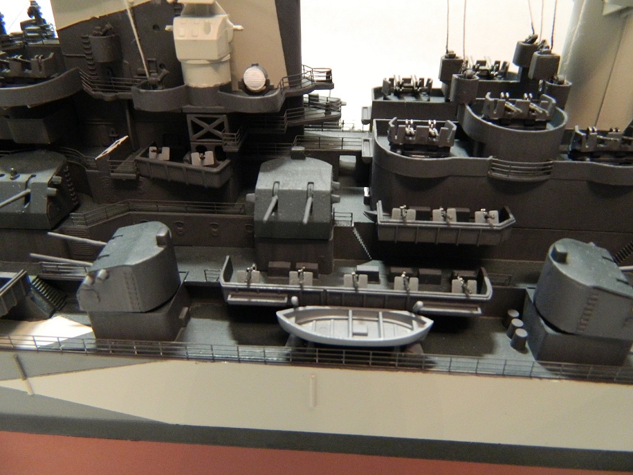 Очень понравилась окраска модели. ОЧЕНЬ ХОРОШО! Кто то скажет что не хватает тонировки но это на любителя. Из замечаний довольно таки толстый такелаж получился, и штатные штыревые антенны, их бы лучше сделать из ворса щетины от кисточек, щеток, а то смотрятся как мачты. Также портит впечатление кормовой кран для самолетов, конечно в фототравлении он смотрелся бы лучше, но можно было бы просто опустить его в походное положение к палубе, тогда бы он не был так заметен. И есть сомнения по поводу флагов, флаг на мачте ближе к корме похож на гюйс, если это так тогда он должен быть на носовом флагштоке.