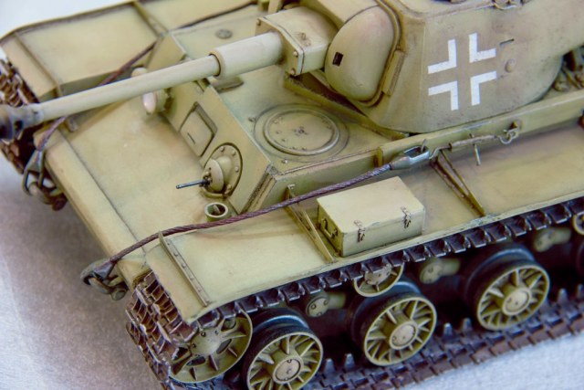 Представляю вашему вниманию трофейный КВ-1. Какую именно модернизацию проделали немцы, думаю нет смысла описывать. Модель задумывалась как немного поездившая после перекраски, поэтому следы эксплуатации по минимуму. Этот танк мне подарил несколько лет назад друг, именно этот подарок послужил катализатором к началу моей модельной деятельности, за это время я потихоньку покупал для него дополнеия, т.е. траки от фриула, фототравление от Эдуарда и Абера, точёный ствол Абер, когда всё собралось приступил к стройке. Что переделывал, расписывать не буду, видно на последних фото, да кресты задул аэром через трафарет. Окраска как обычно: акрил Тамия, смывки, фильтры и пигменты Миг. Что получилось судить вам, приятного просмотра!