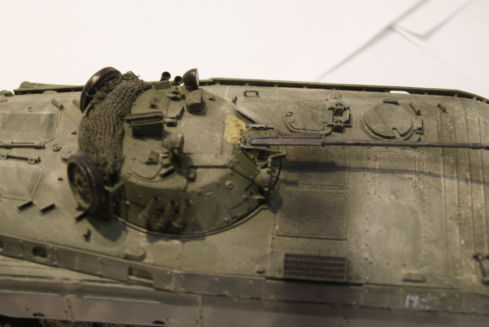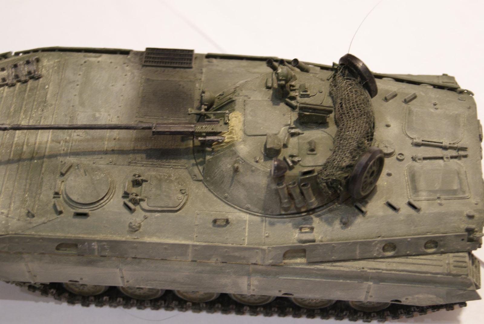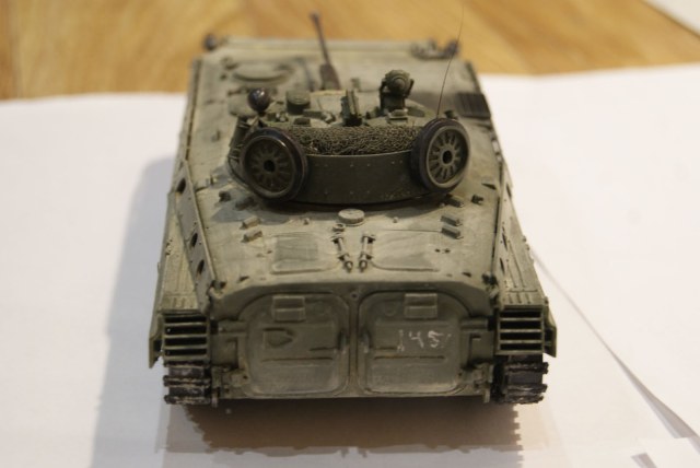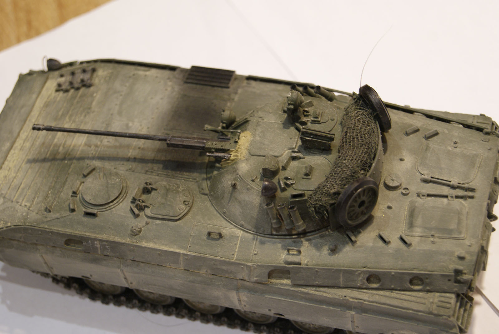 Очень сильный и утрированный он вышел. Видны линии, как наносился, в масштабе это ого-го какие его потоки обдували) И еще очень равномерно все забито. Теряются мелкие детали, швы, щели между люками... Даже на приведенных фото видно, что пыль забивается в узких местах, и уж потом оседает на ровных поверсхностях. У БМП довольно высокий корпус, а у вас он равномерно покрыт, даже крыша башни.