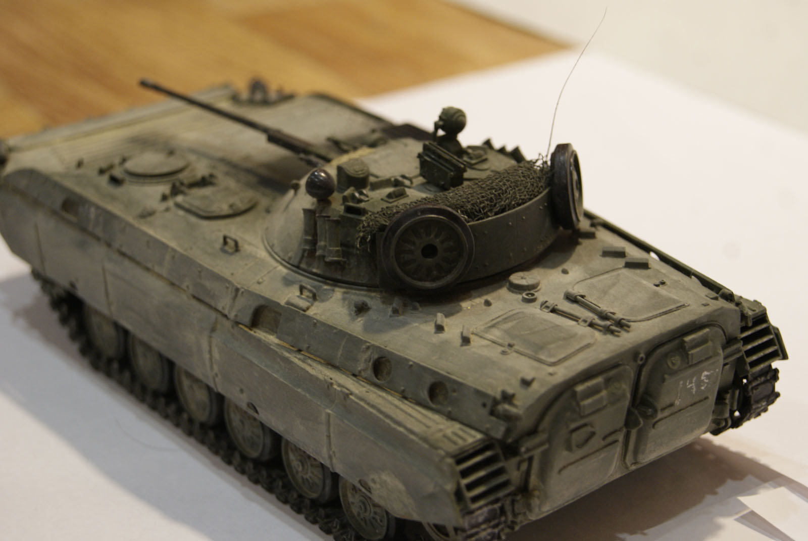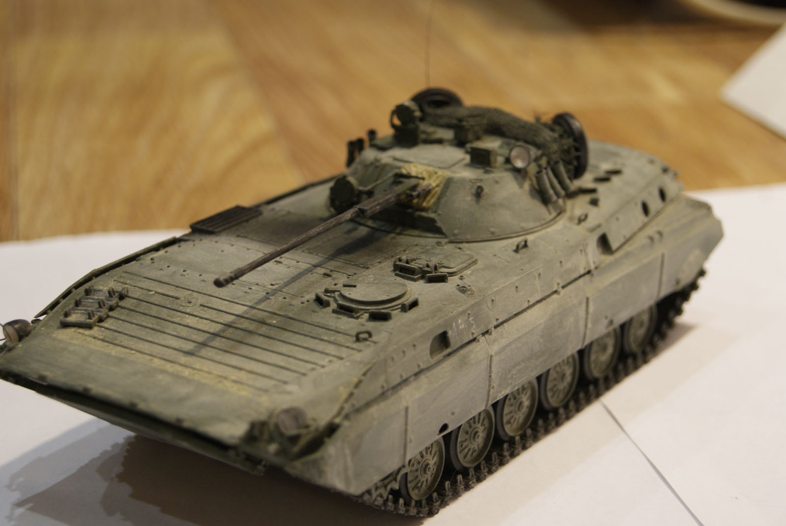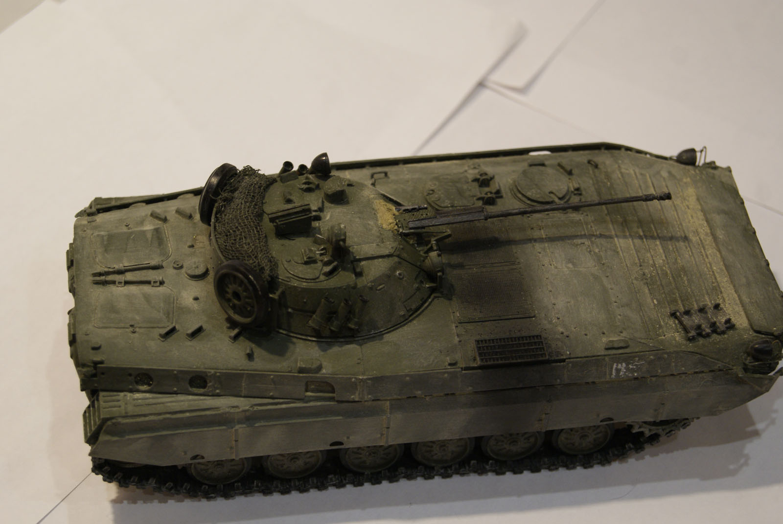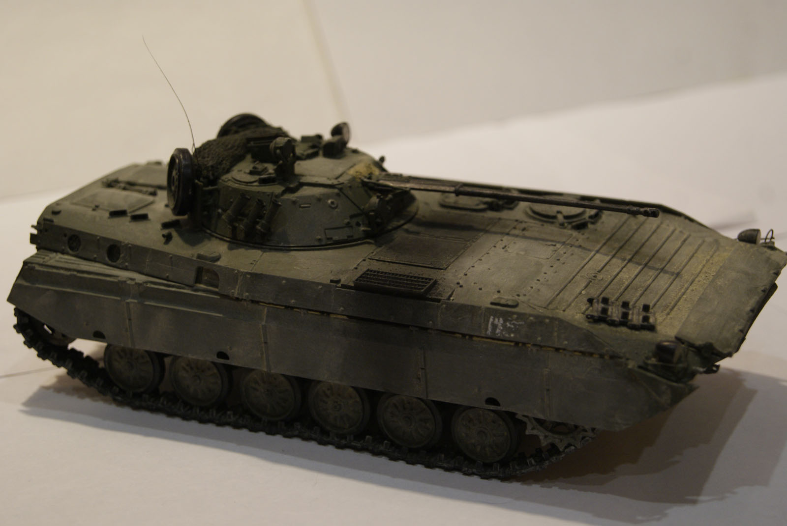 Очень сильный и утрированный он вышел. Видны линии, как наносился, в масштабе это ого-го какие его потоки обдували) И еще очень равномерно все забито. Теряются мелкие детали, швы, щели между люками... Даже на приведенных фото видно, что пыль забивается в узких местах, и уж потом оседает на ровных поверсхностях. У БМП довольно высокий корпус, а у вас он равномерно покрыт, даже крыша башни.