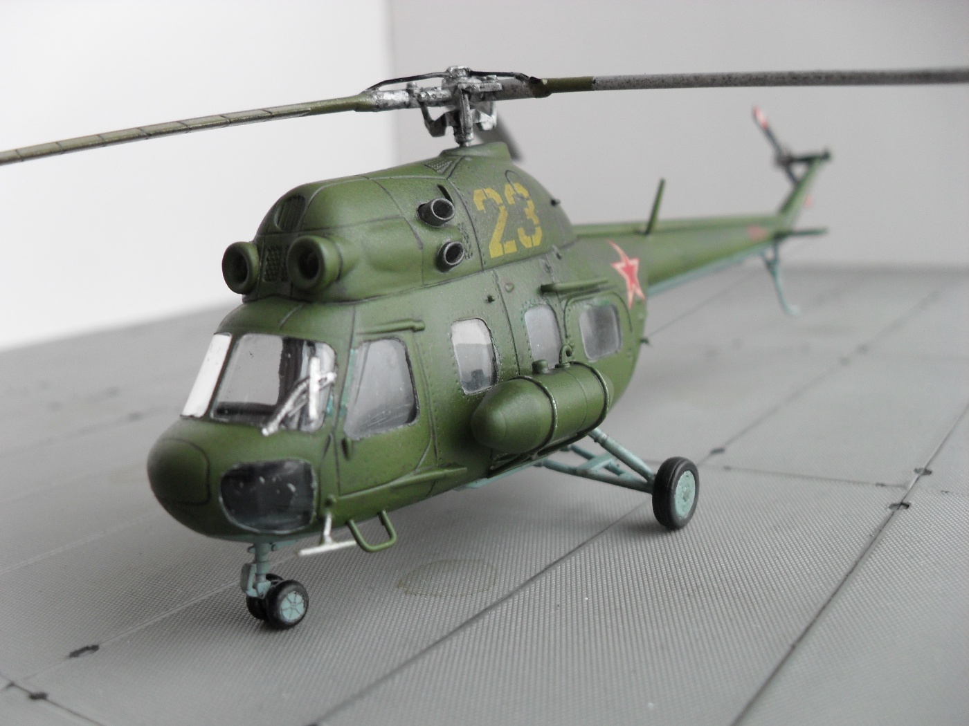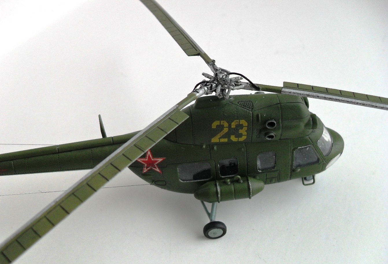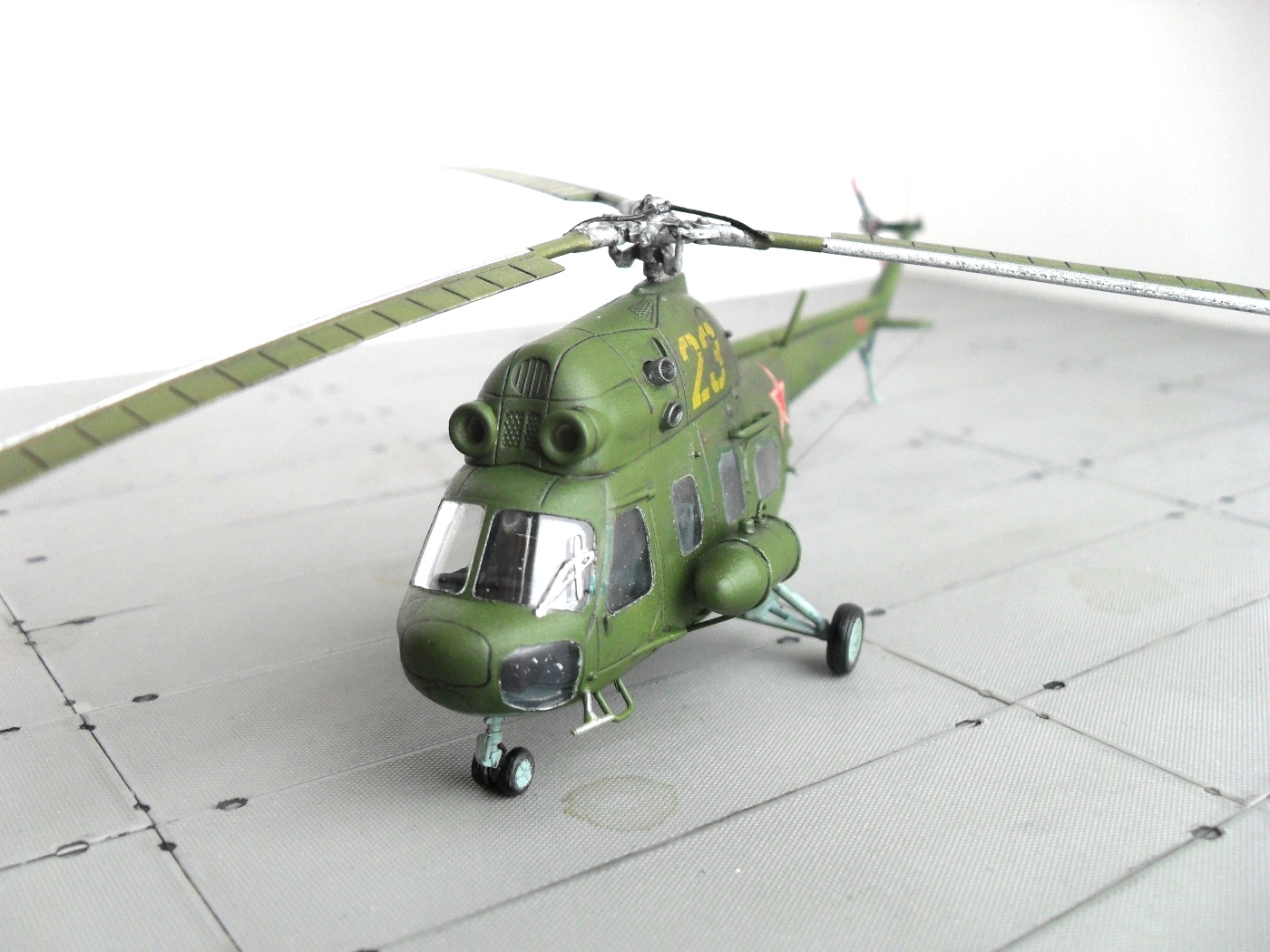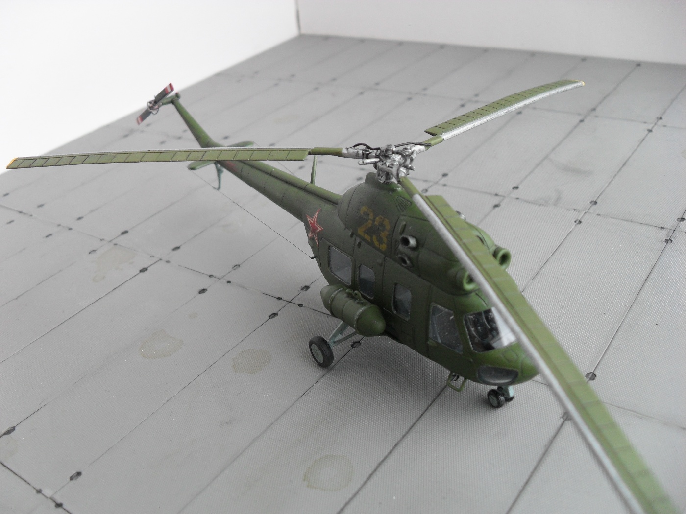 Цветных фото прототипа естественно не нашел, так что, модель скорее по мотивам. Из запасов декалей подобрал номер 23 «желтый», такой вертолет 100 % был в подразделении. Модель окрашена акрилом «Тамия», цвета подмешивал на глаз, по памяти. Смывка – гуашь + «Фейри». В конце матовый лак TS – 80 «Тамия».
