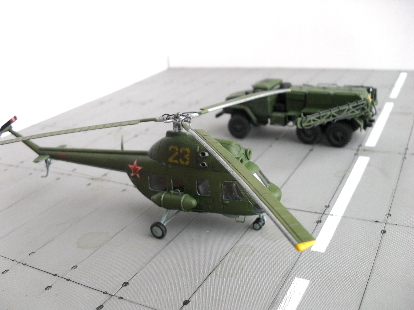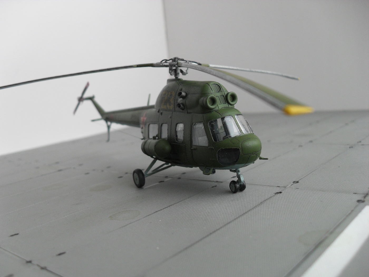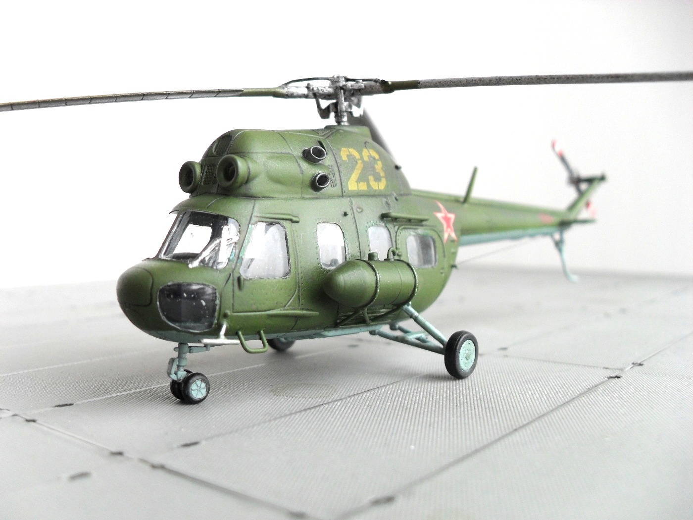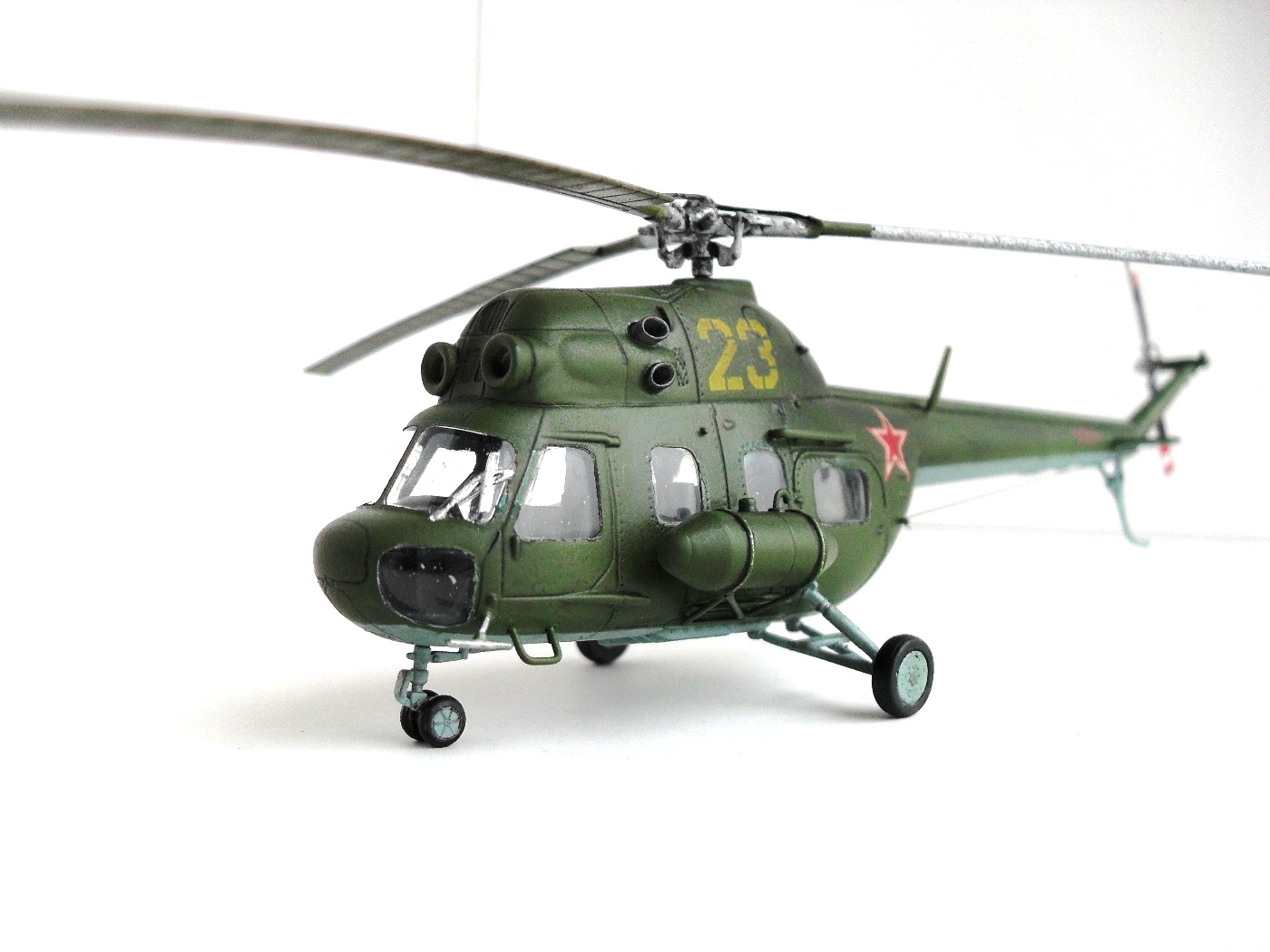 Цветных фото прототипа естественно не нашел, так что, модель скорее по мотивам. Из запасов декалей подобрал номер 23 «желтый», такой вертолет 100 % был в подразделении. Модель окрашена акрилом «Тамия», цвета подмешивал на глаз, по памяти. Смывка – гуашь + «Фейри». В конце матовый лак TS – 80 «Тамия».