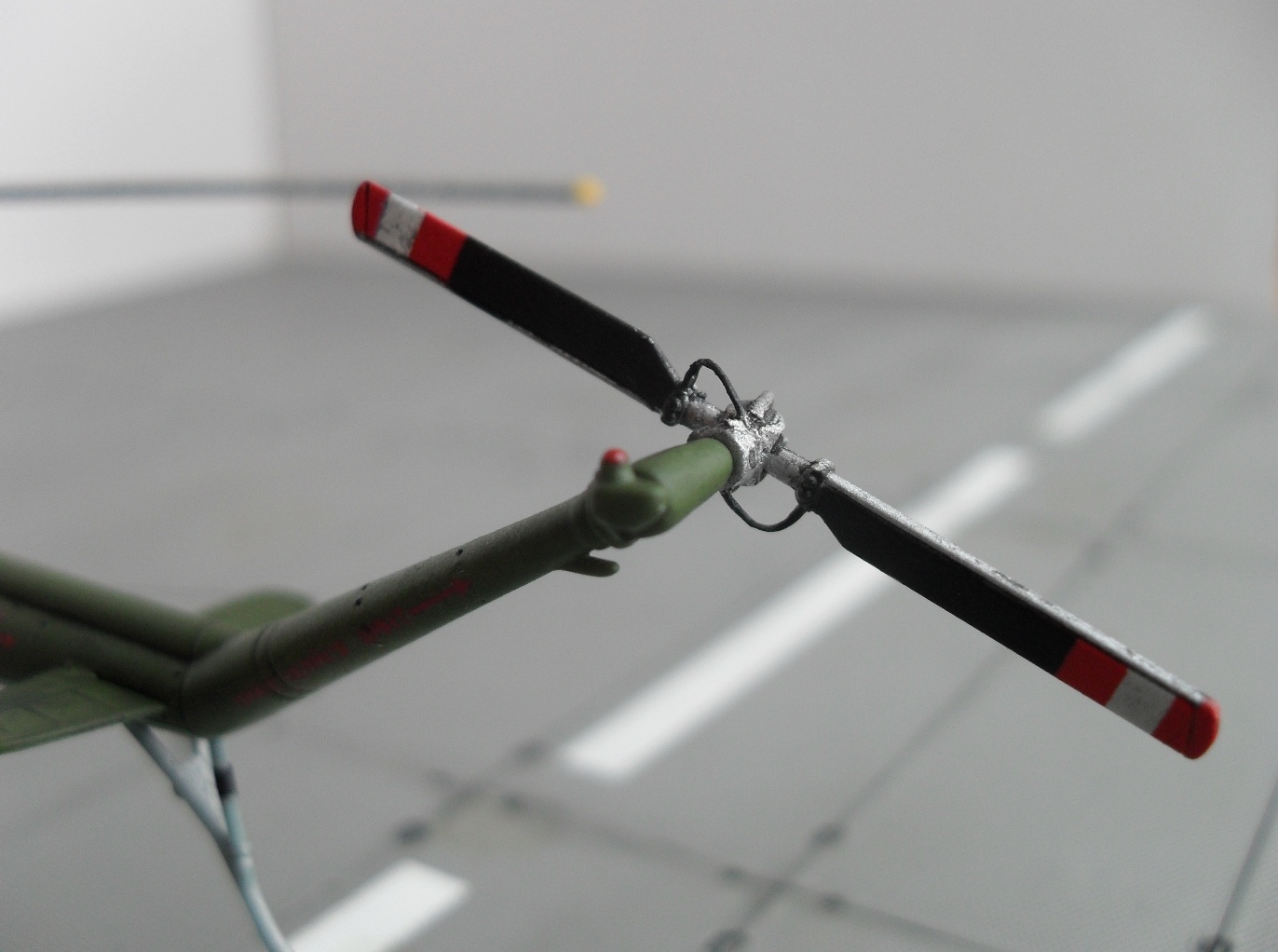 Несущий винт взял от польского Ми -2, т.к. тот, что дают наши китайские товарищи ни в какие ворота не проходит. Втулка НВ у «Хобби Босса» хоть и покрасивше будет, но размеры ее уж чересчур гоблинские… Правда изрядно пришлось повозится со старой краской на «польском» несущем винте, измазюкал я его от души, да еще и кистю.
