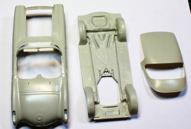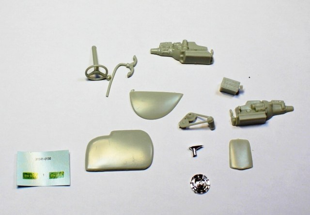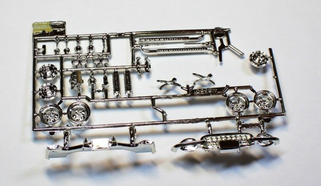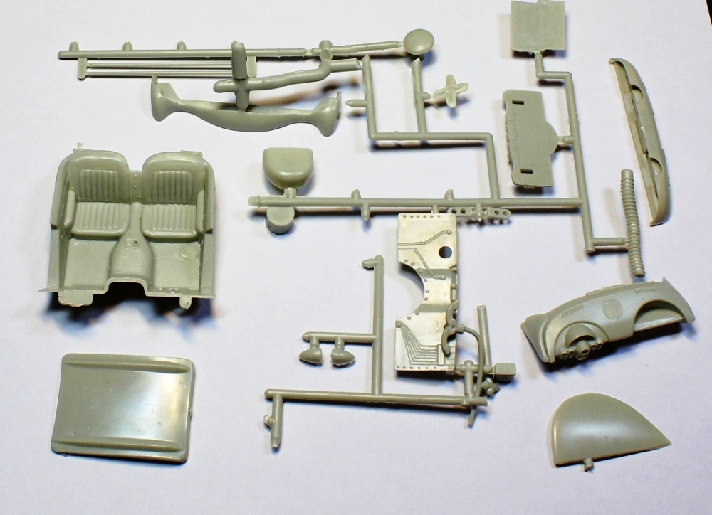 В средних размеров коробке россыпью и на литниках среднего качества детали, множество облоя и следов от пресс-форм. На фото дана модель открытого типа, но прилагаемая крыша предполагает на закрытый вариант. Инструкция по сборке 1 большим листом. Колесные диски в наборе есть, резины нет. Кит в руки попал совершенно случайно.