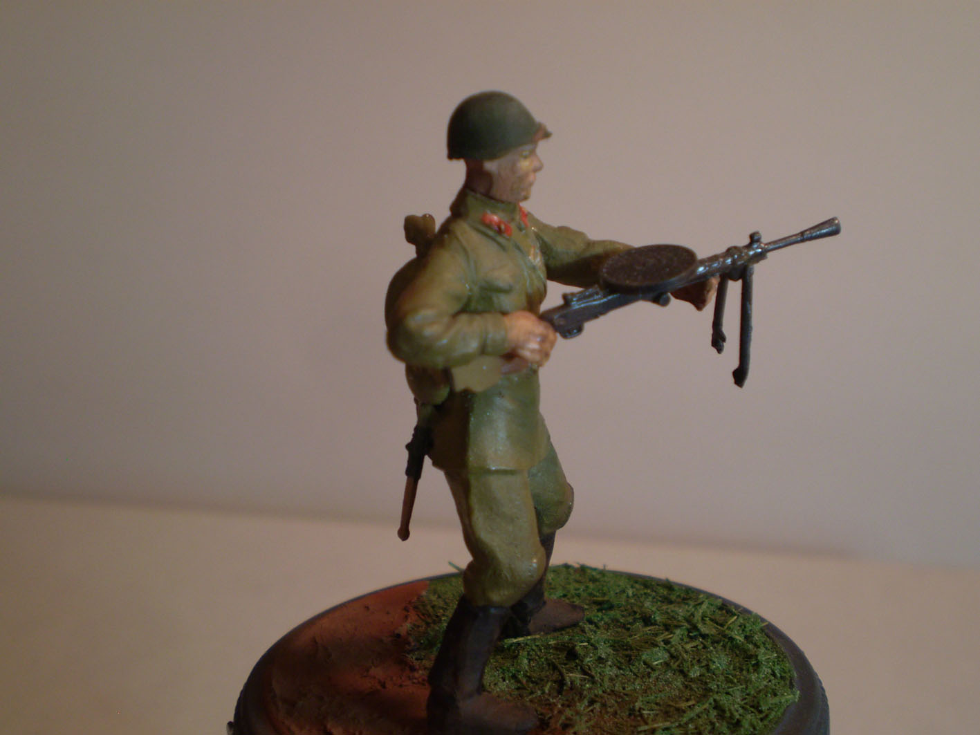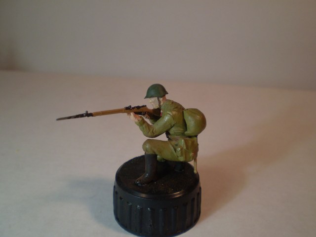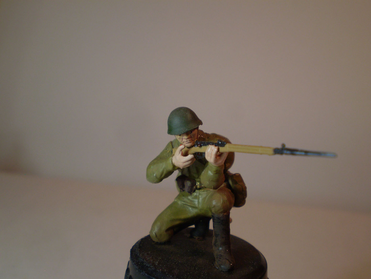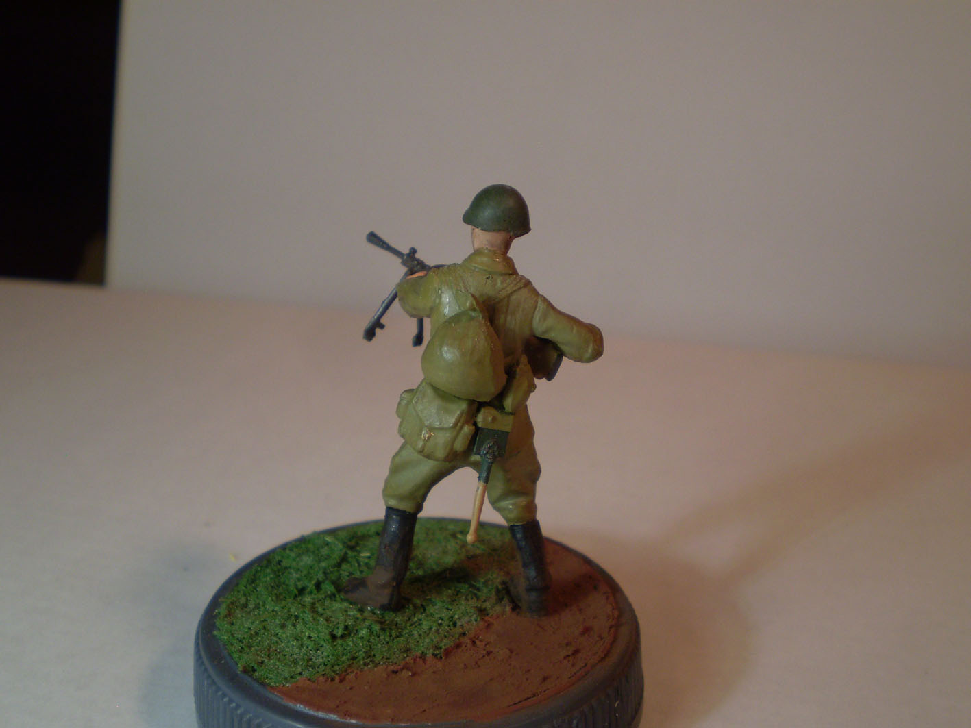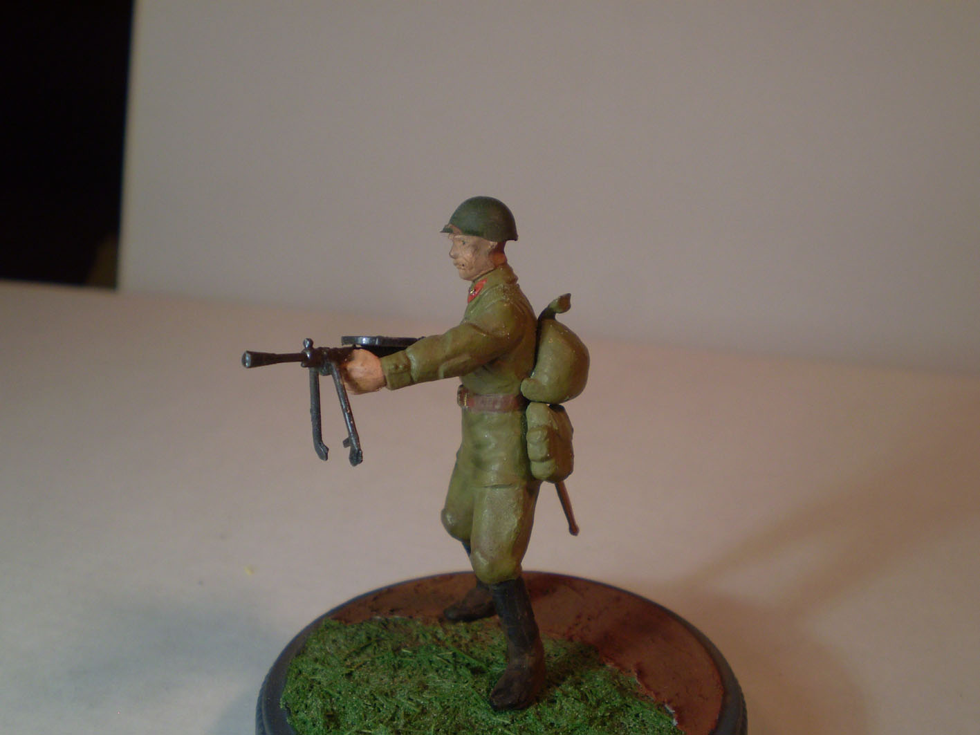 Дружище, у Вас есть аэрограф? Если нет, то не жалейте на него денег, полезнейшая вещь. Мне понравилось то, что у этих фигурок достаточно четко покрашена амуниция, есть петлицы, пряжки и т.п. Но ведь блестят, что портит все. И вот тут поможет матовый лак из аэра. Теперь о глазах. Не получилось. Уж лучше рисовать глазёнки просто черными точками, заточенной зубочисткой.
