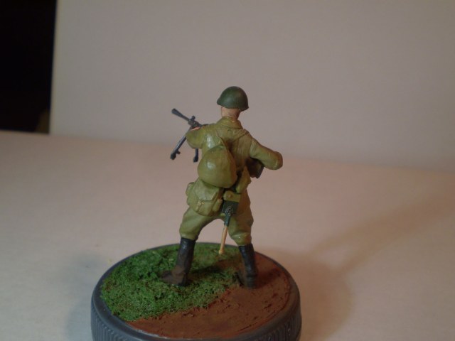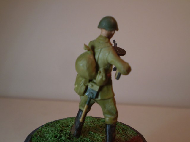 по сборке-на фото №4 видно, что вещмешок приклеен не на свое место, а со смещением. Ремни на спине отдельно, а "сидор" сам по себе.Также бросается в глаза отсутствие ремня на оружие. Виден облой и смещение при клейке, особенно на юбке гимнастерки.
