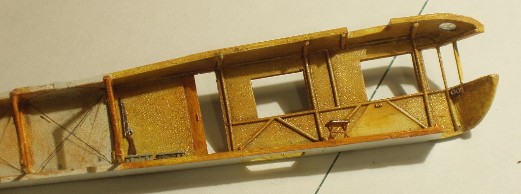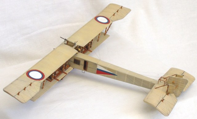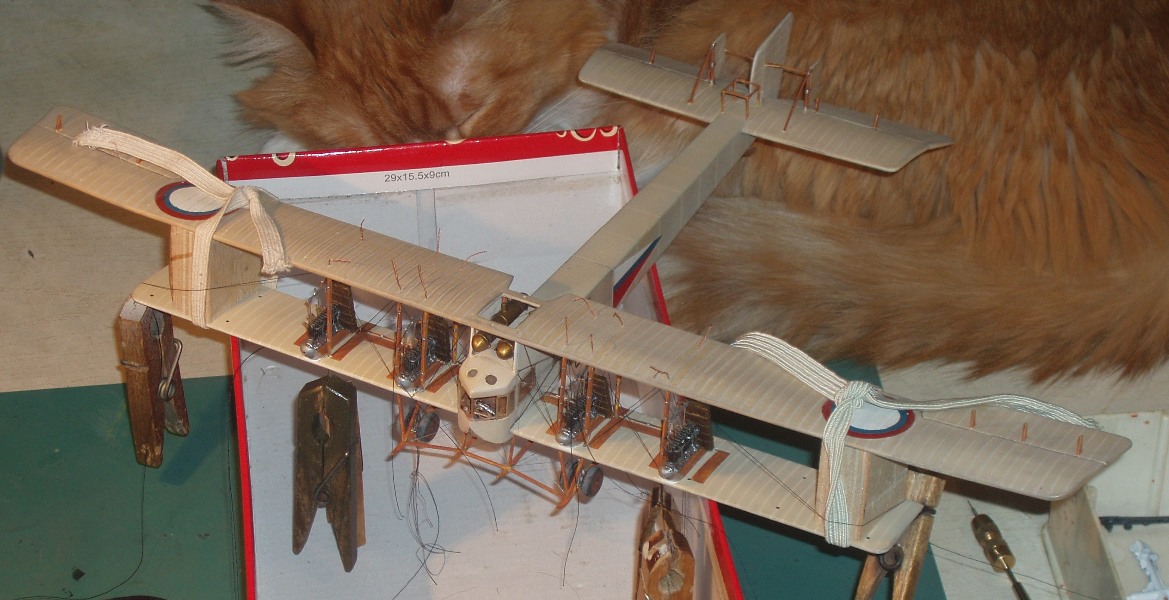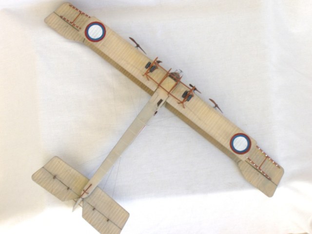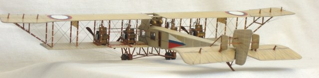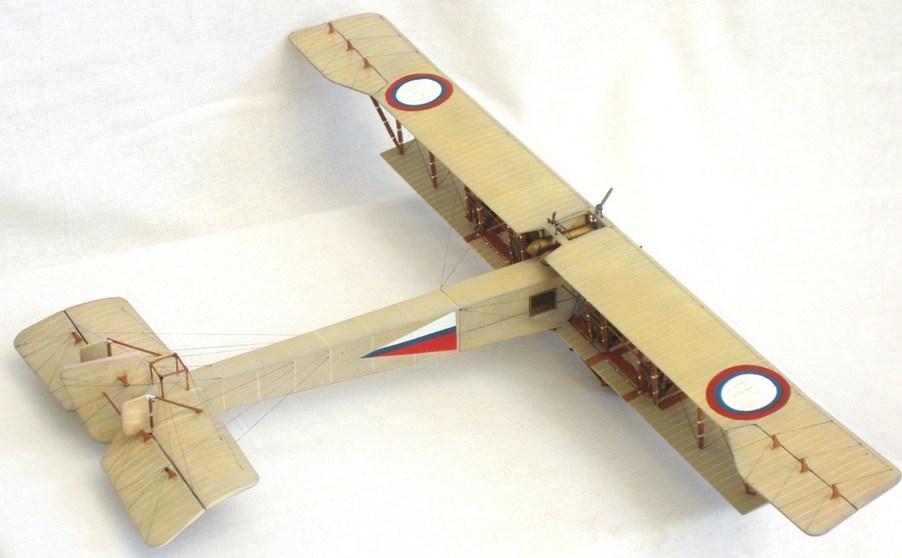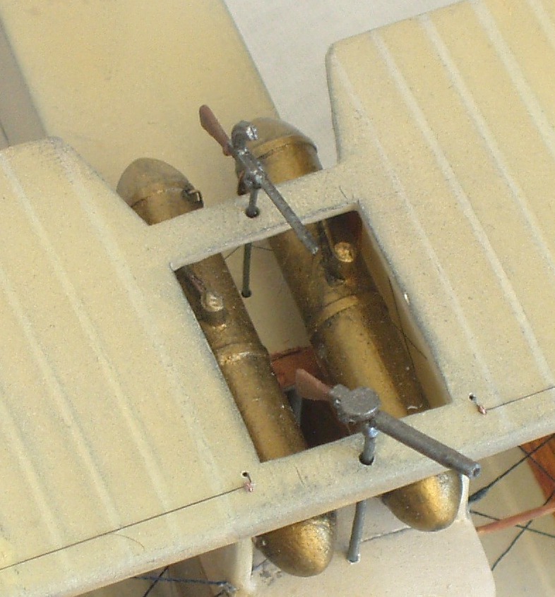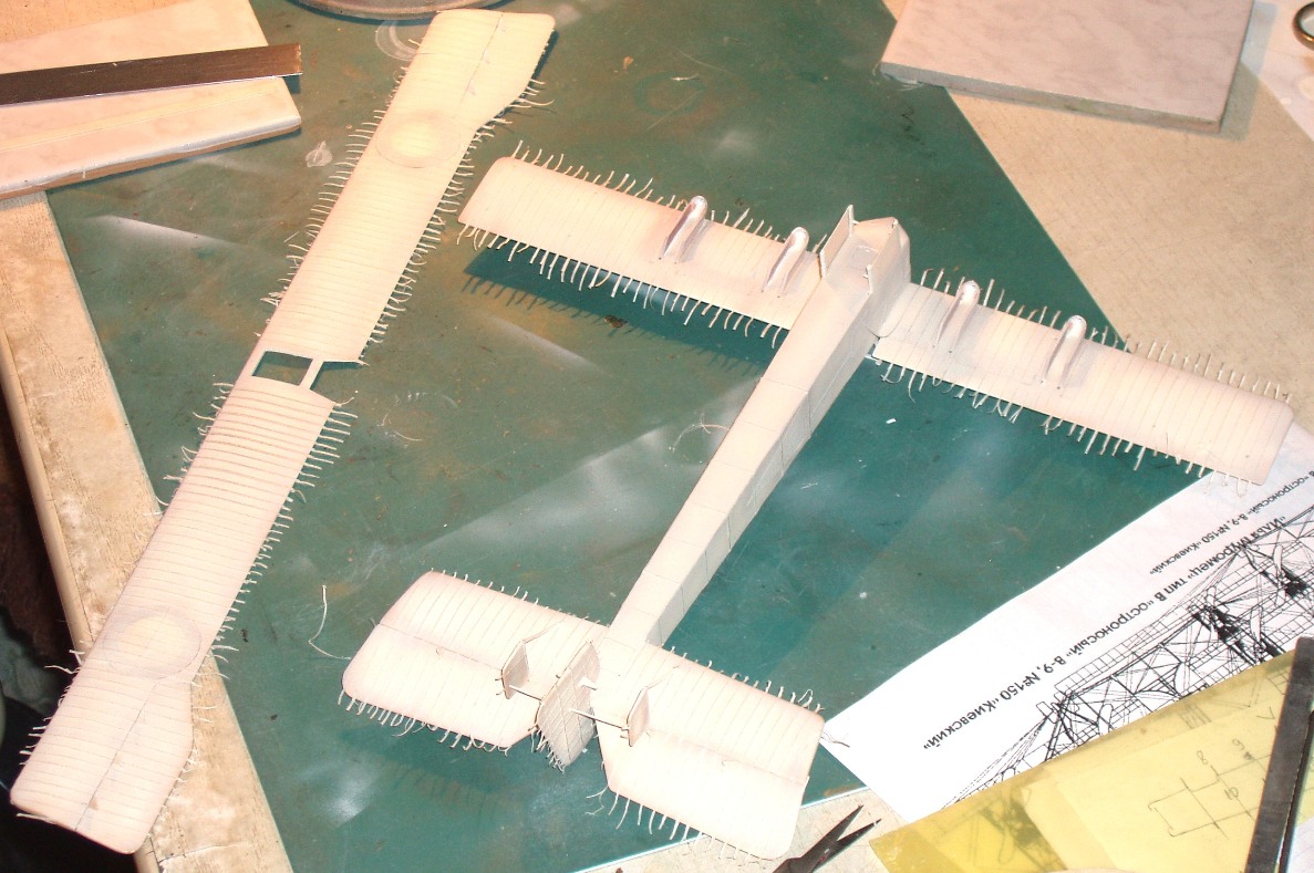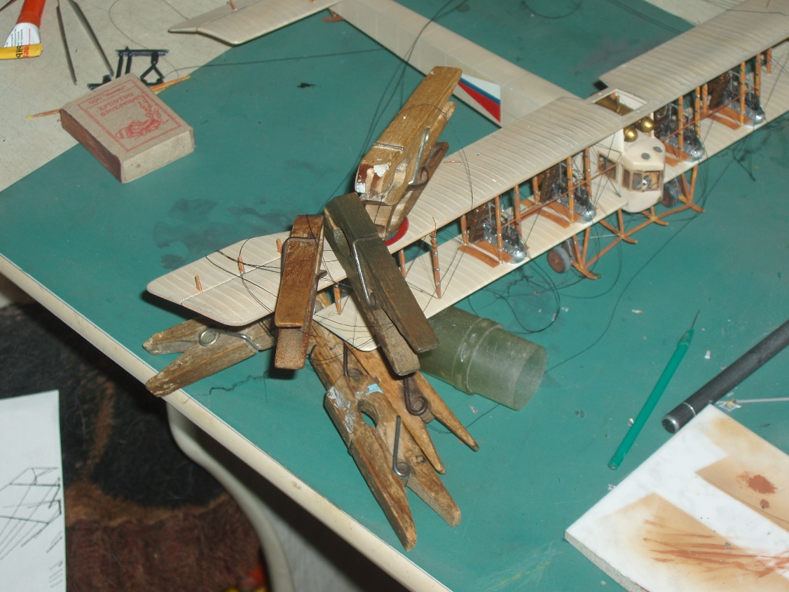 Заново, из тянутого литника и «доширапластика» изготовлены короткие стойки и «полотно» центроплана под верхним крылом. Из того же пластика были изготовлены дополнительные стабилизирующие полотна между пятыми папами стоек.