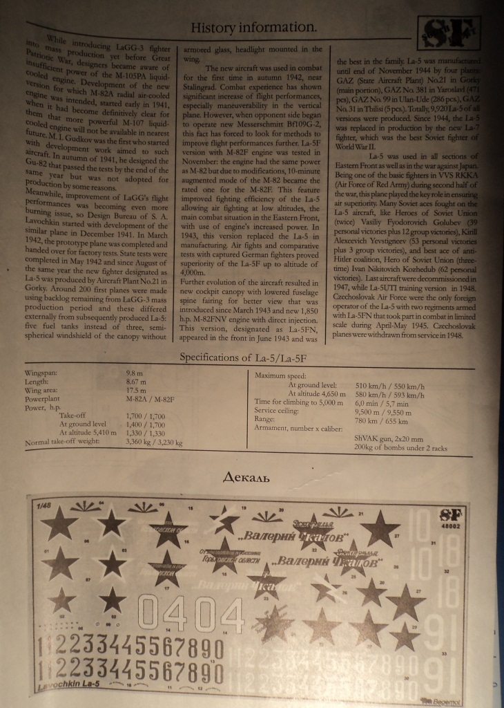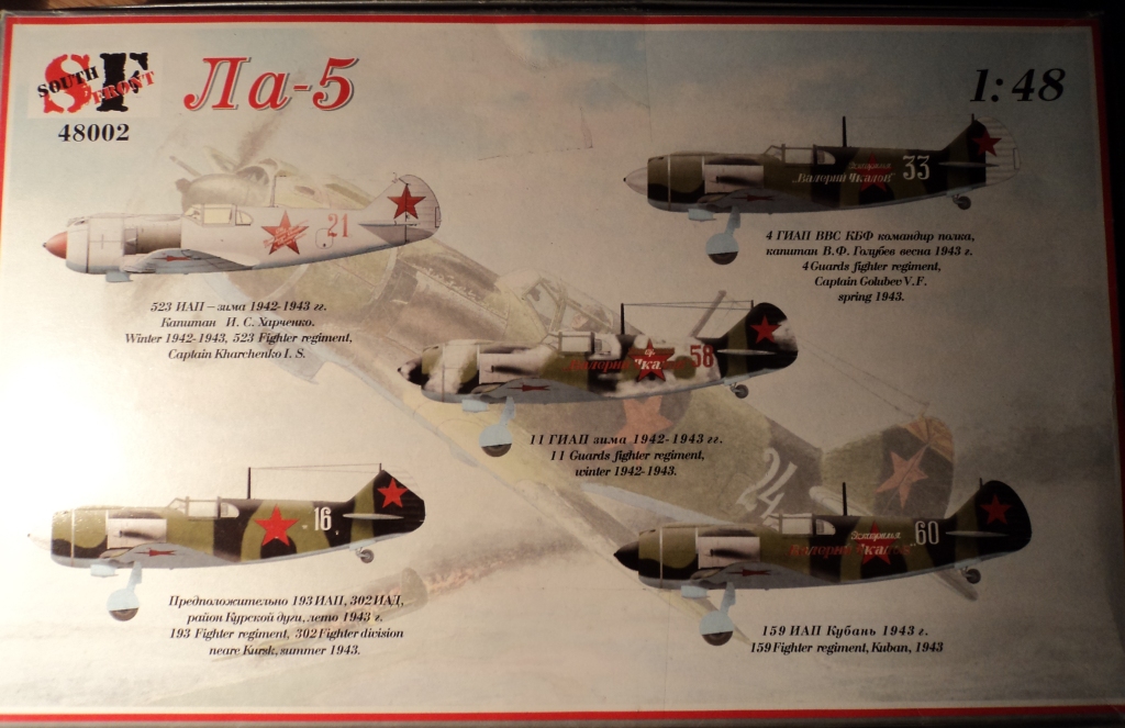 Модель продается в картонной коробке стандартных размеров. На лицевой стороне изображен Ла-5Ф ранней модификации. На обратной стороне еще 5 вариантов окраски для Ла-5 и Ла-5Ф ранних. На ребрах информация о производителе и о самолете.