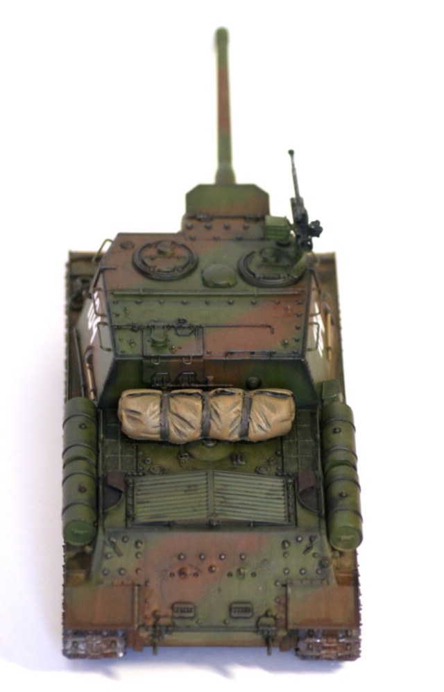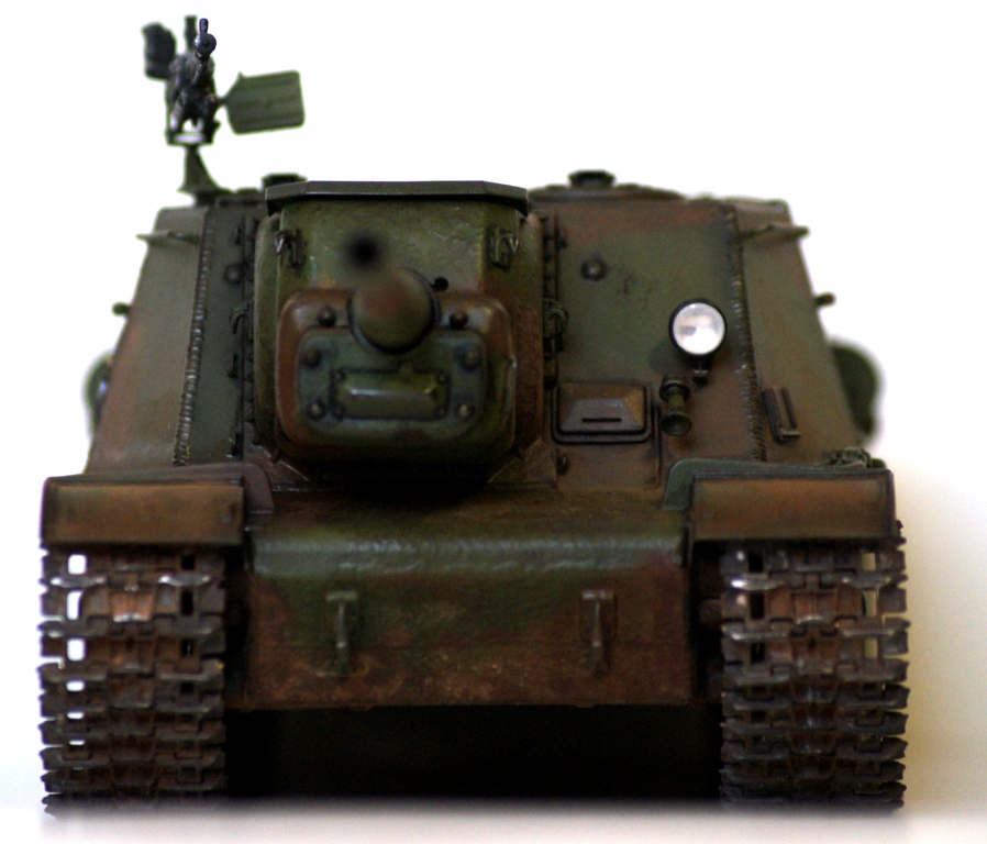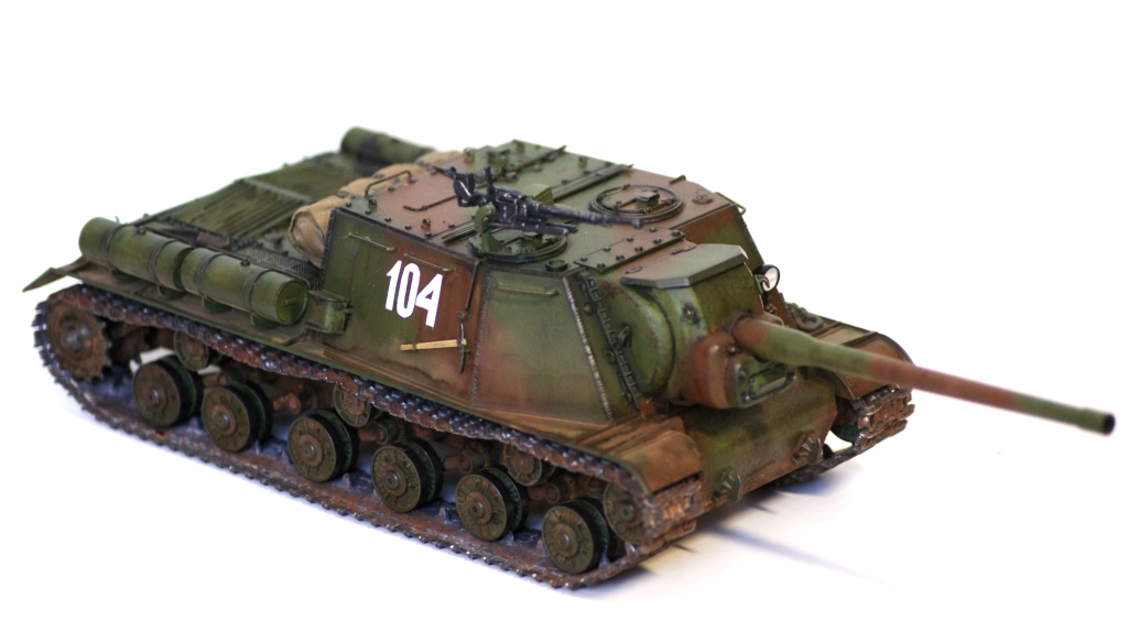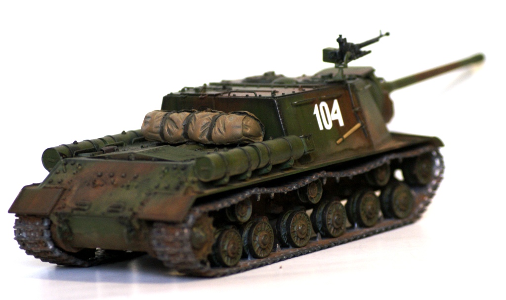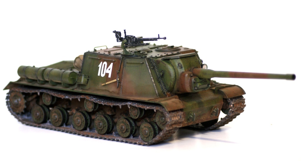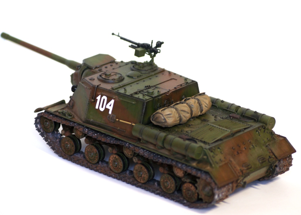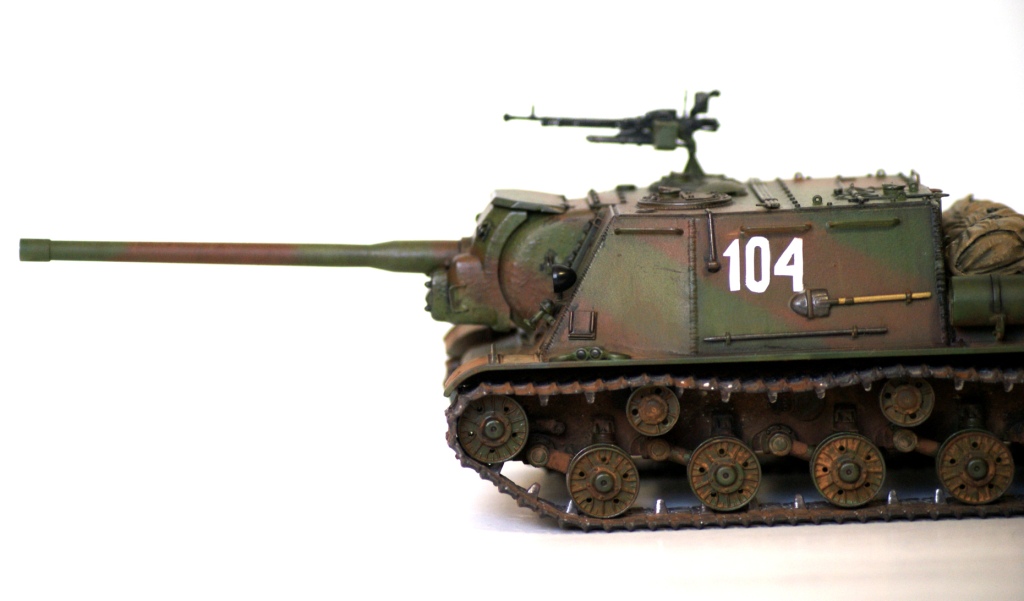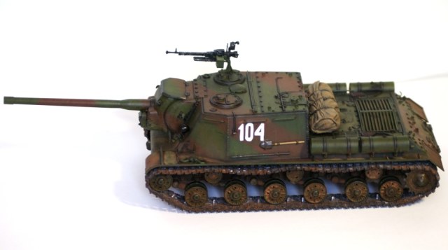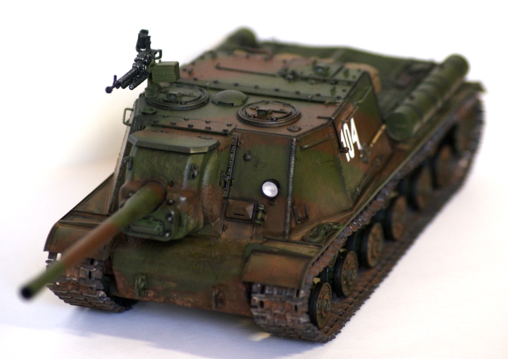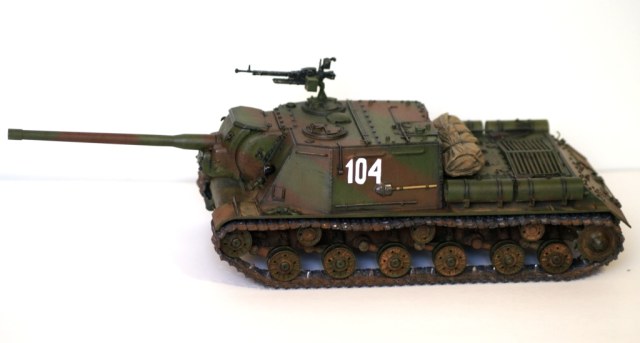 Данной моделью я открываю серию строек тяжелых САУ советской армии следующие планирую ИСУ-122С и в завершении ИСУ-152. Когда модель была уже покрашенной и я собирался начать делать смывку то неожиданно наткнулся на несколько интересных боковиков, и решил неделать модель скучного зеленого цвета взяв за основу один из них. Фото боковика прилагаю.