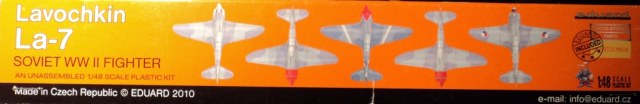 Модель дана нам в коробке стандартных размеров. на лицевой стороне изображен самолет Ла-7 Василия Зайцева.