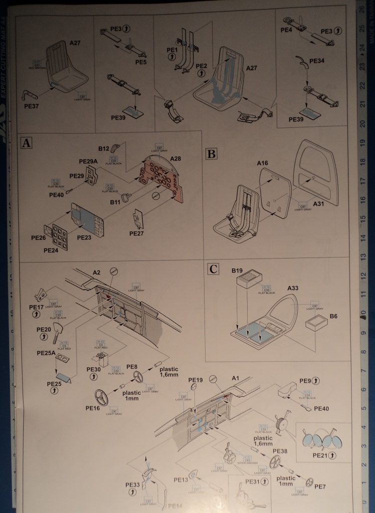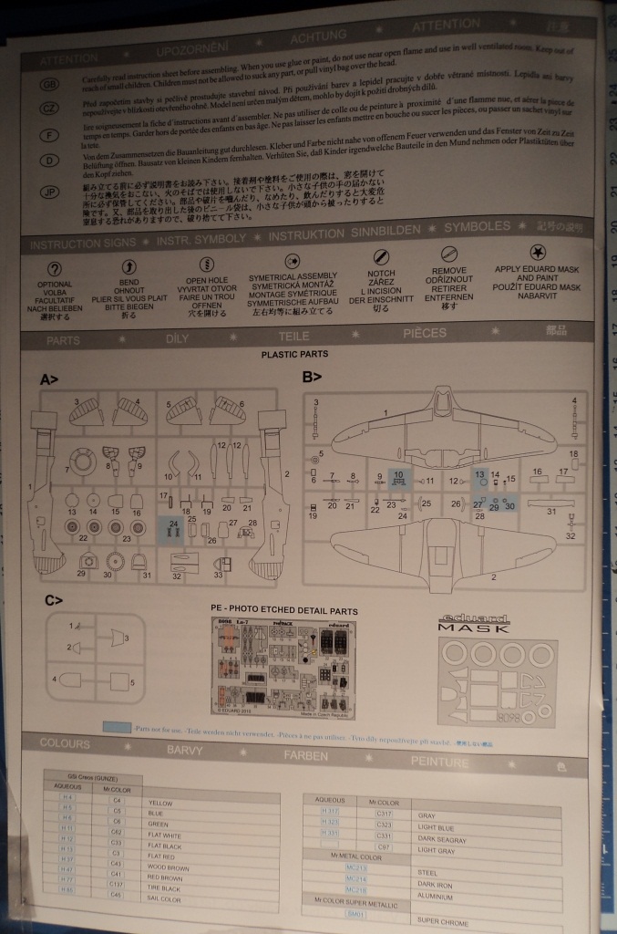 Набор состоит из красочной инструкции в виде глянцевой книжки формата А4 12 страниц. В инструкцию включены: информация о самолете на английском и чешском языках, информация о наборе, инструкция по сборке (довольно понятная), инструкция по окраске (6 вариантов), а так же инструкция по нанесению технички и расшифровка цветов. Как ни странно, цвета АМТ-7, АМТ-11 и АМТ-12 даны верно.