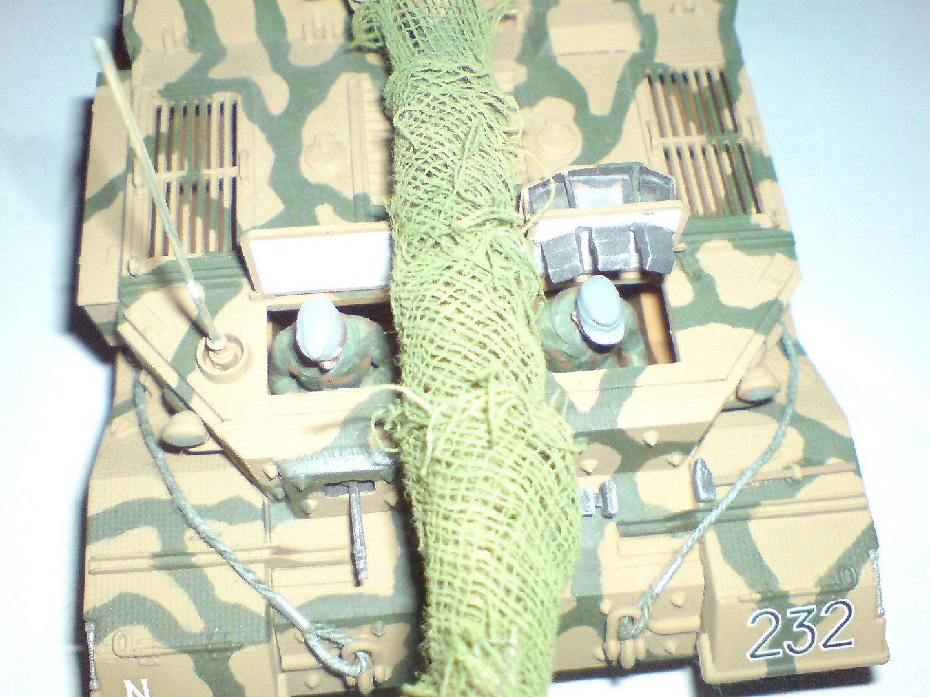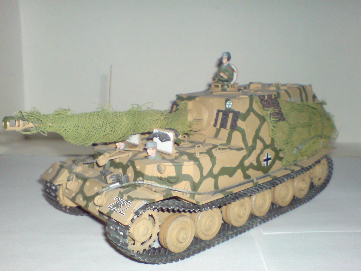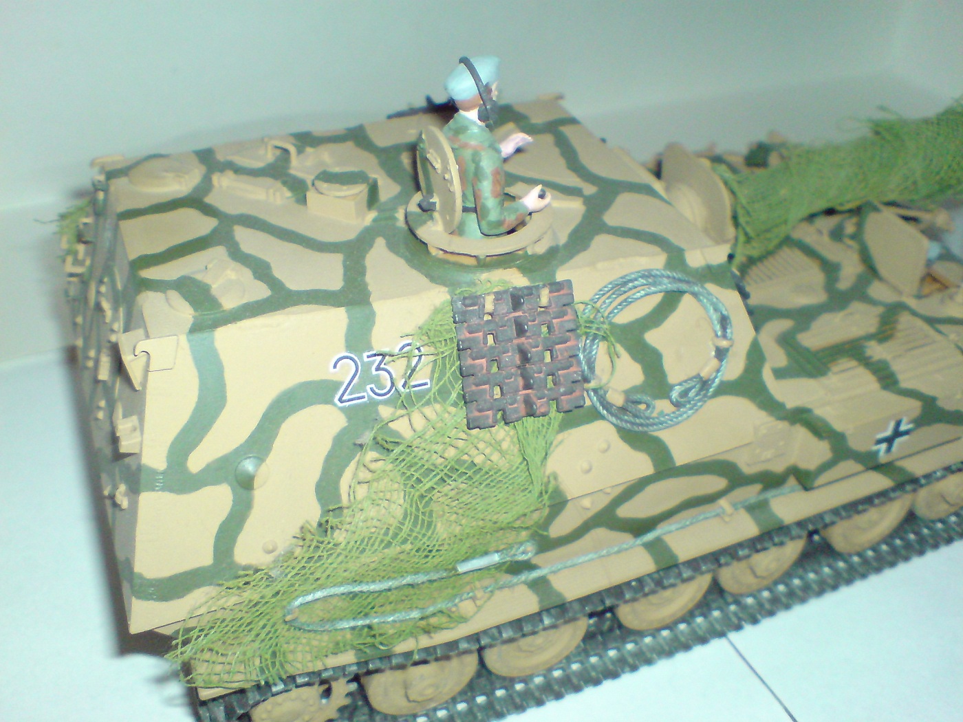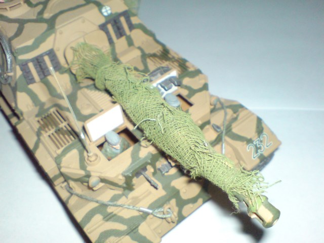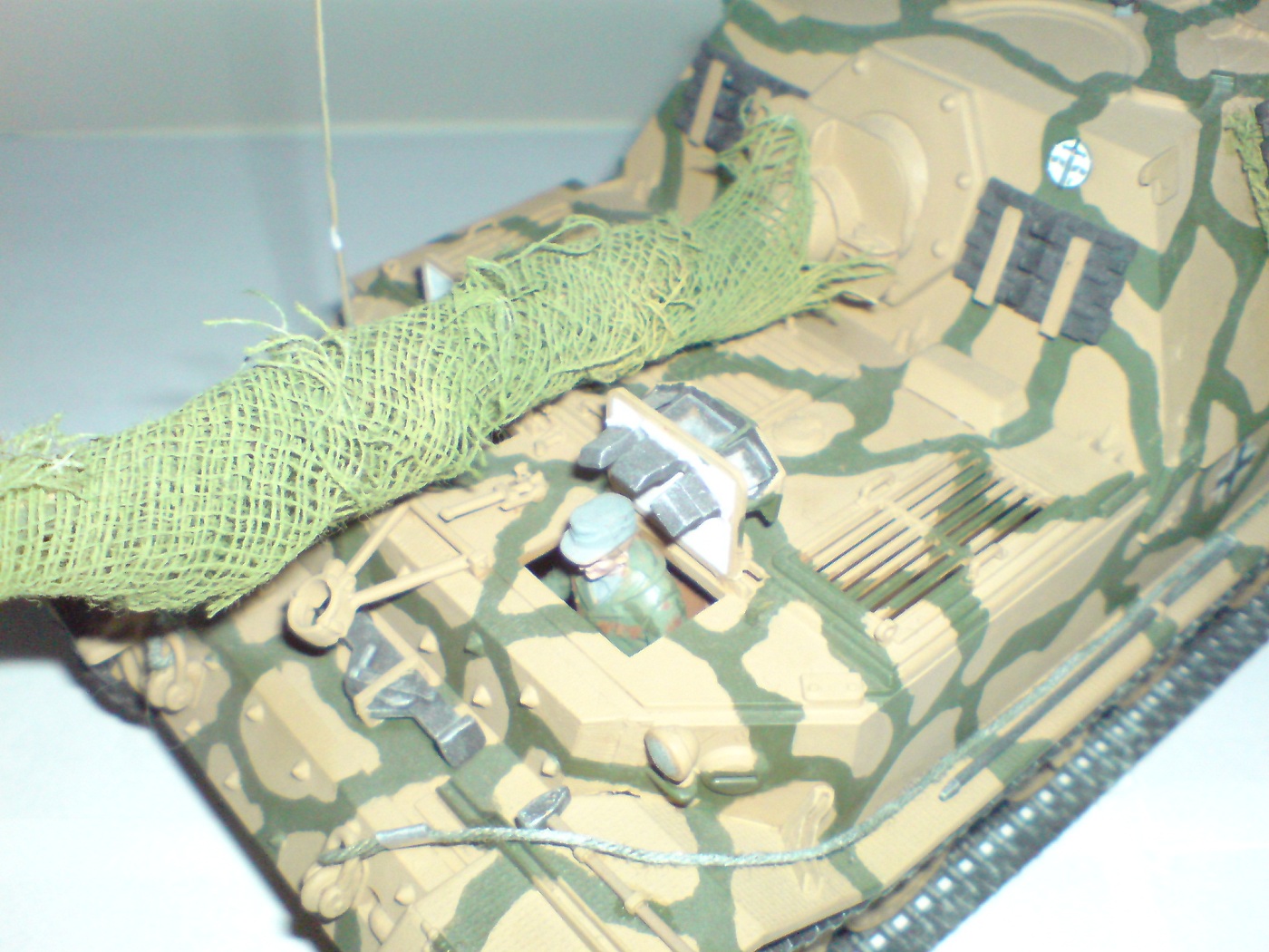 Работа одна из первых поетому што есть, тросы добовлял сам в комплекте и в инструкции они вобще непредусматривались. Красил кистью пентафталевыми красками на которых даже не написана марка производителя, лаки и прочая химия неиспользовались капля имитация незжи на траках, маск сеть сделана из медицинского бинта. В общем както так.