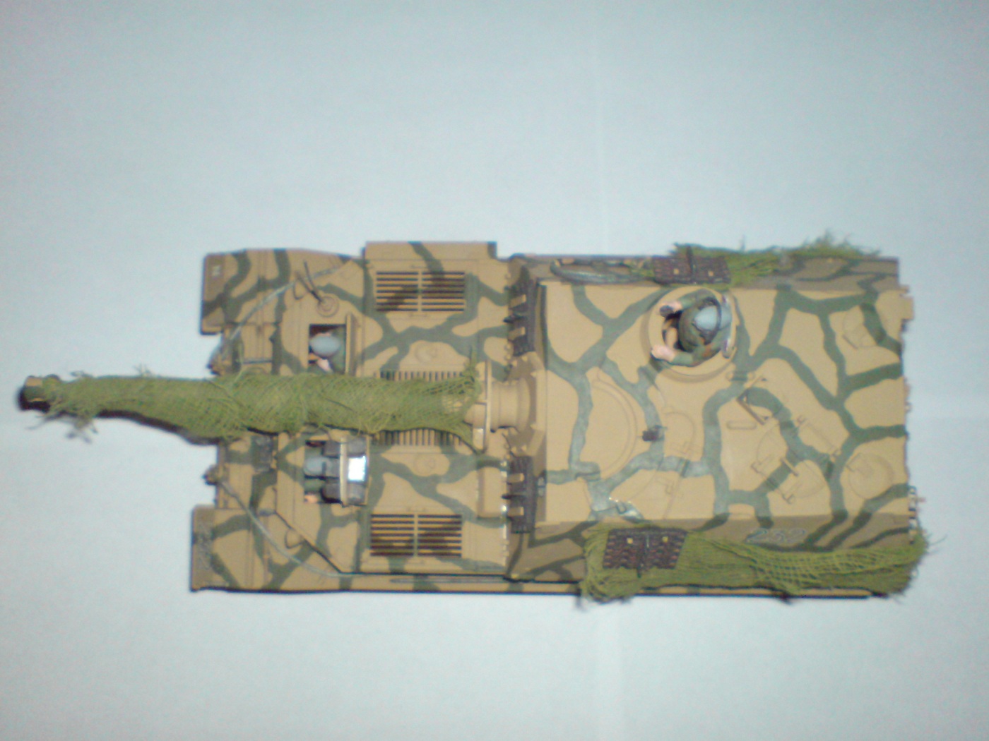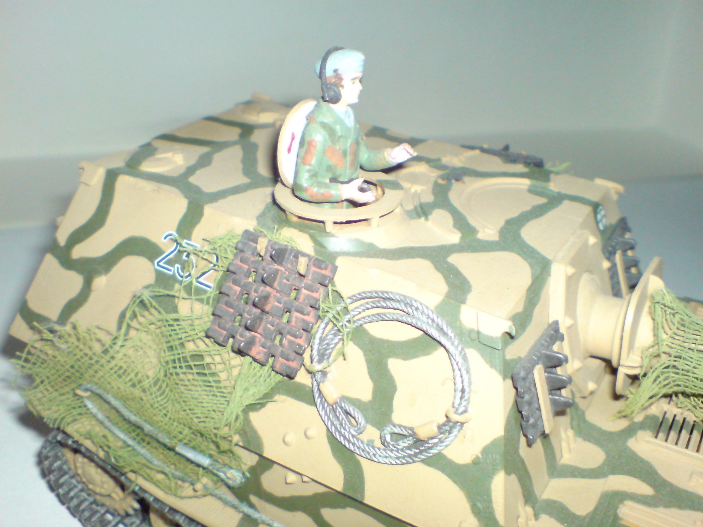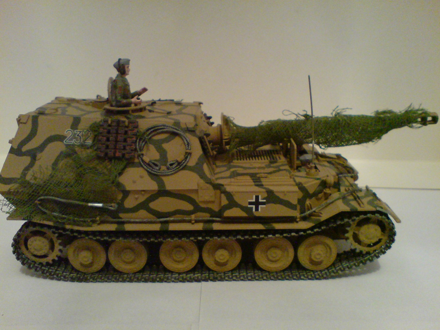 Работа одна из первых поетому што есть, тросы добовлял сам в комплекте и в инструкции они вобще непредусматривались. Красил кистью пентафталевыми красками на которых даже не написана марка производителя, лаки и прочая химия неиспользовались капля имитация незжи на траках, маск сеть сделана из медицинского бинта. В общем както так.