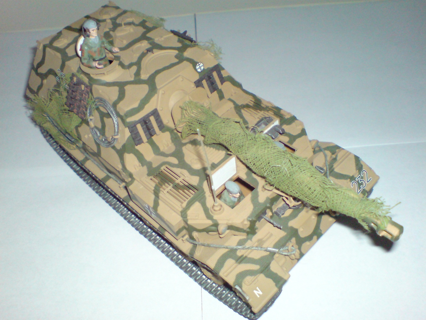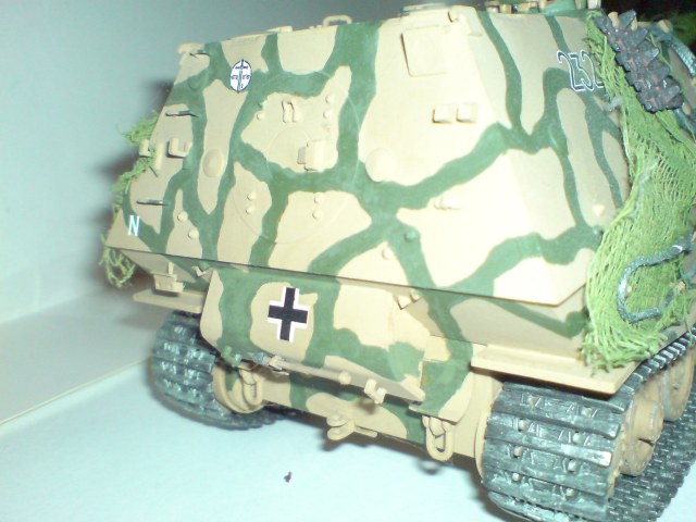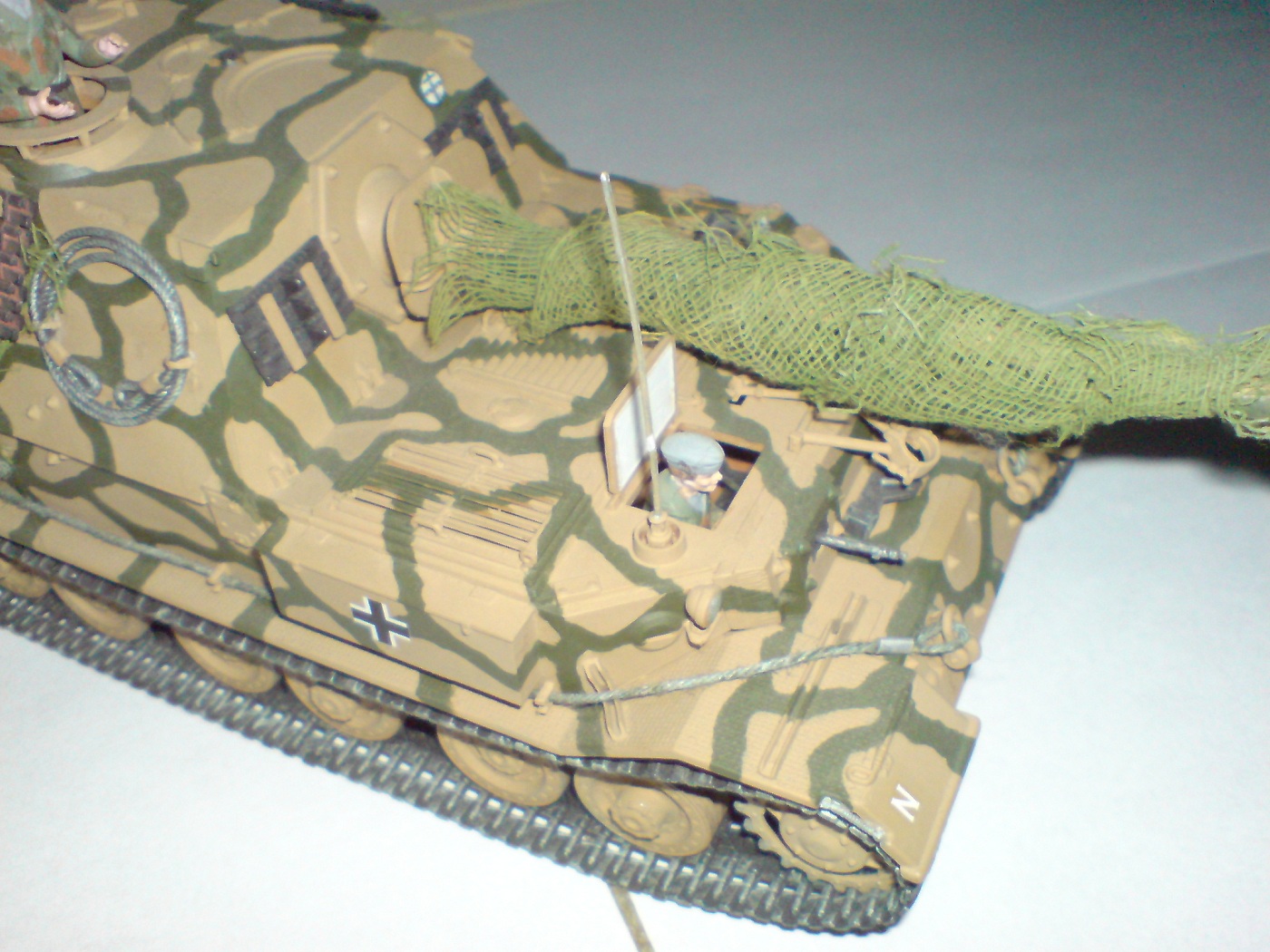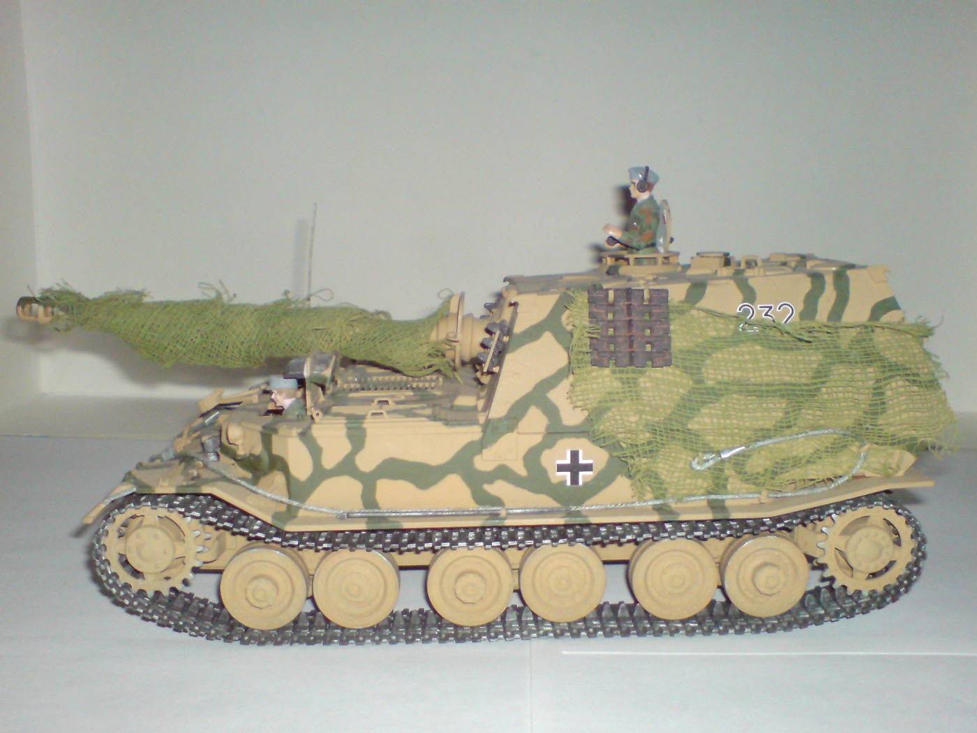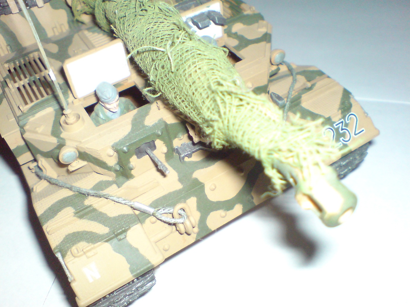 Работа одна из первых поетому што есть, тросы добовлял сам в комплекте и в инструкции они вобще непредусматривались. Красил кистью пентафталевыми красками на которых даже не написана марка производителя, лаки и прочая химия неиспользовались капля имитация незжи на траках, маск сеть сделана из медицинского бинта. В общем както так.