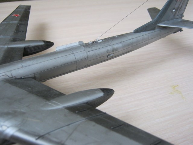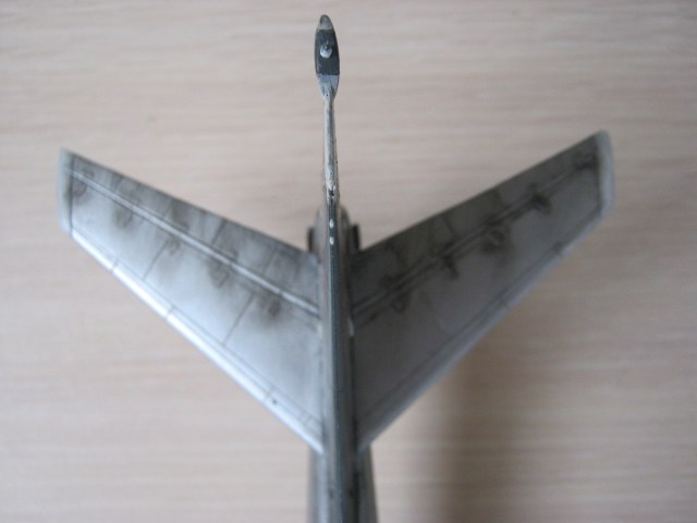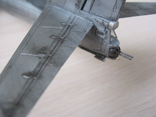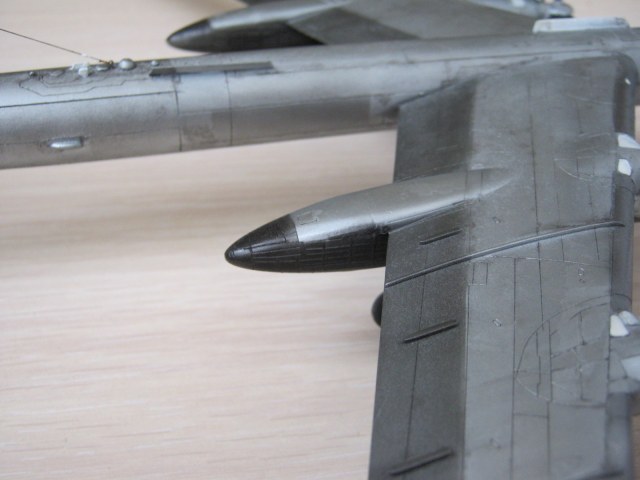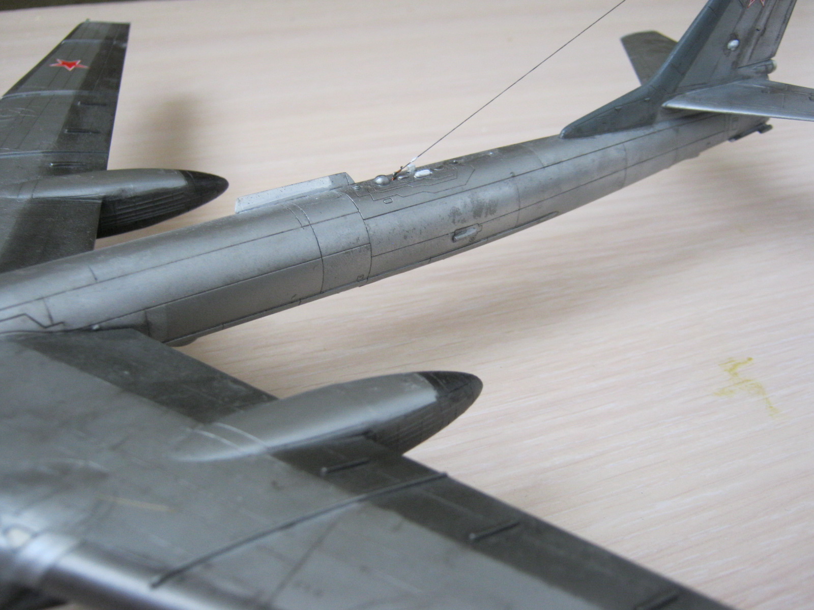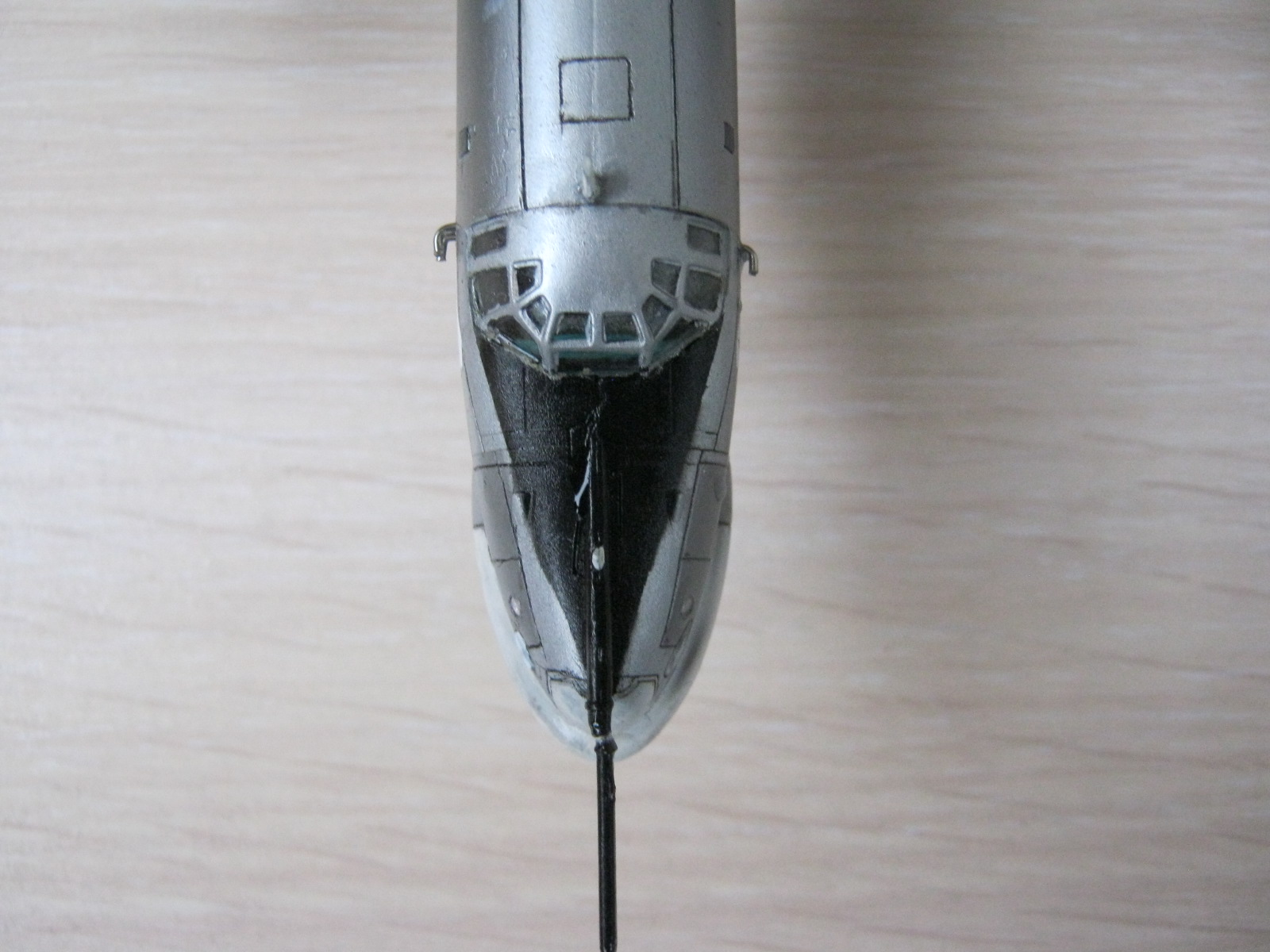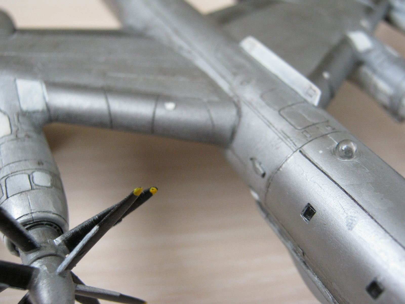 Сама сборка особых проблем не доставила - одно удовольствие. Стыкуемость деталей - на уровне. Из доработок: ПВД - игла для шприца, антенна - мононить для бисероплетения. Из проволоки сделал имитацию гидравлики на стойках шасси. Но не все так безоблачно. Что не понравилось. Стыковка крыла и мотогондол двигателей, особенно внутренних. Большие зазоры, соответсвенно, шпатлевка и ошкуривание. Расшивку пришлось нарезать по-новой. Заправочную штангу лучше было-бы сделать отдельной деталью, так как в процессе сборки она всегда за что-нибудь цеплялась и в конечном итоге отломалась. На место я эту штангу приклеил, но это уже не то.