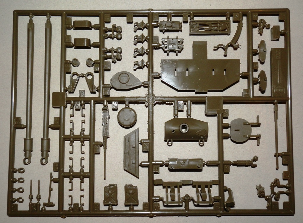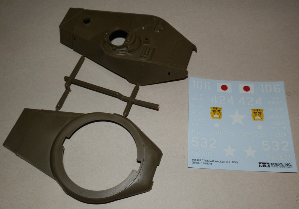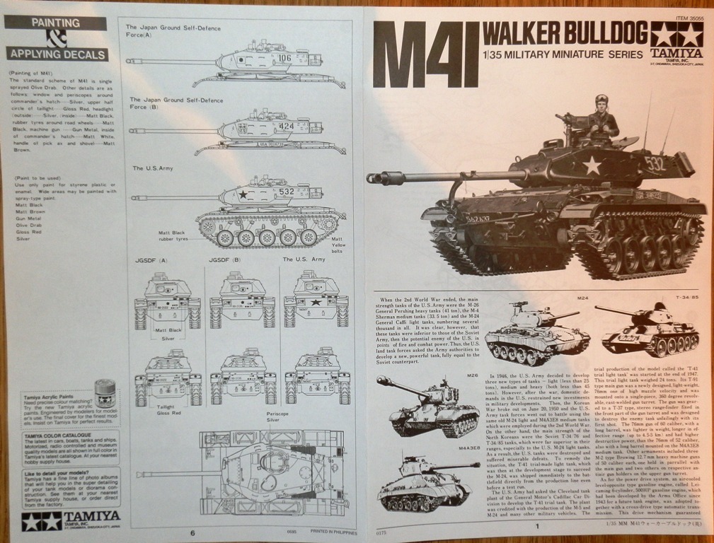 Здравствуйте, уважаемые коллеги! Позвольте представить обзор модели американского легкого танка M 41 “ WALKER BULLDOG” от Тамии. Набор упакован в картонную каробку скромного размера с красочным рисунком в тамиевском стиле. Модель относится к так называемой древней Тамии, на литниках стоит 1975 год. Внутри находятся три литника с деталями танка, ванна корпуса, литник с втулками ходовой, резиновые траки сомнительного качества, декаль и инструкция. Также бонусом идет литник с фигуркой танкиста и двумя американскими бойцами времен корейской войны. Литники оливкового цвета, присутствует незначительный облой, сдвигов форм как и следов толкаелей практически нет. Деталировка весьма скудная, "остекление" отсутствует, правда под приборы наблюдения предусмотрительно оставлены дыры, ящики-решетки-лючки отлиты на верхней части корпуса. Балансиры отлиты целиком с ванной корпуса. Траки представлены двумя гусеничными лентами из довольно мягкой резины, качество которых постарался отразить на фото. Производитель предлагает три варианта окраски танка-два японской и один американской армий.