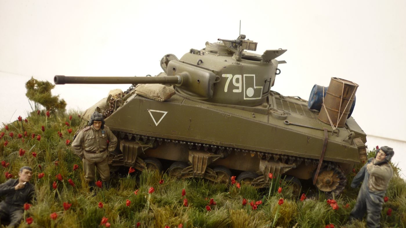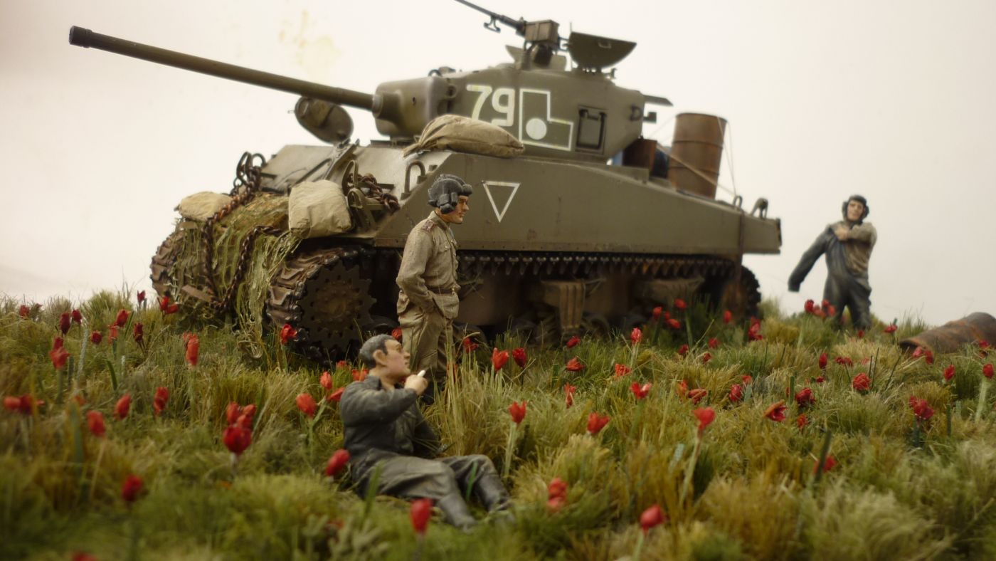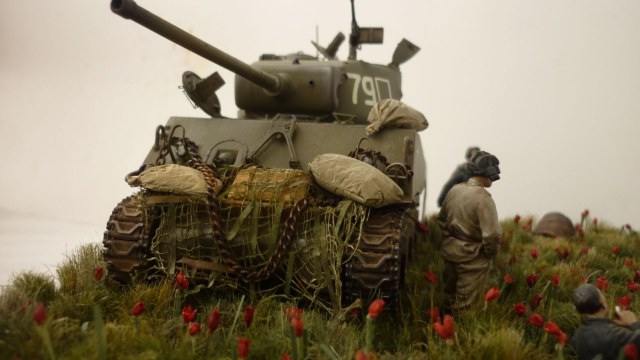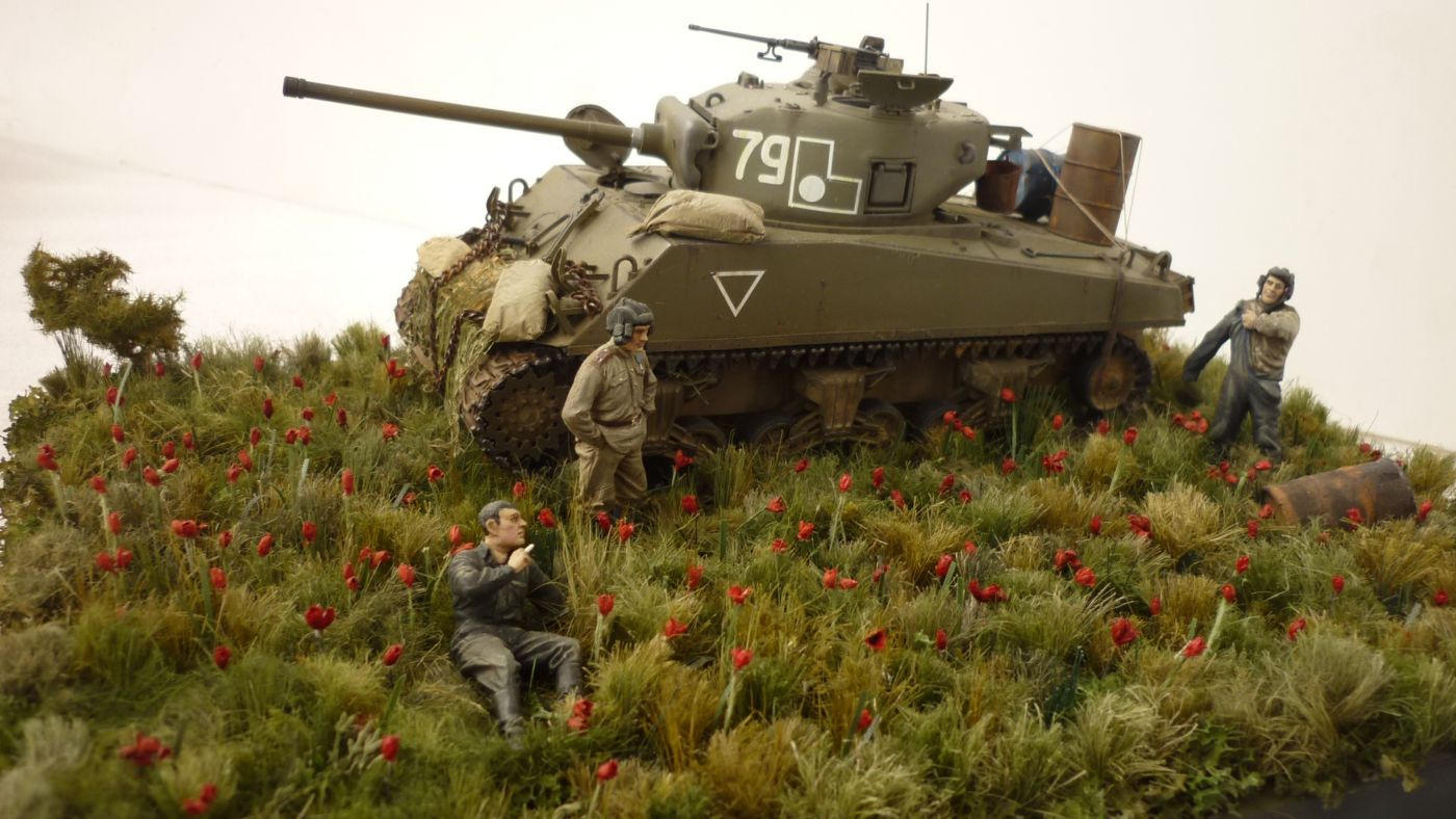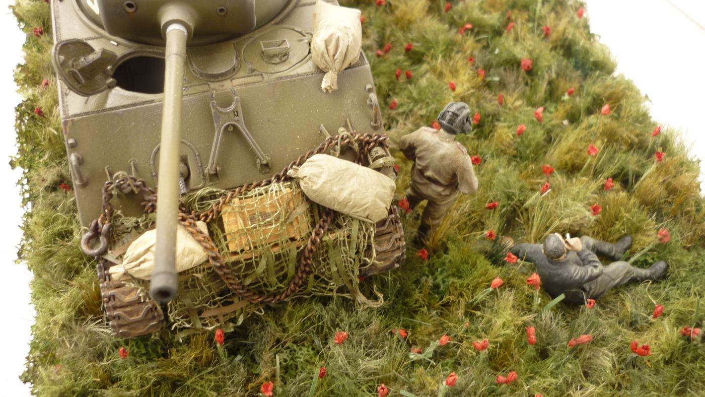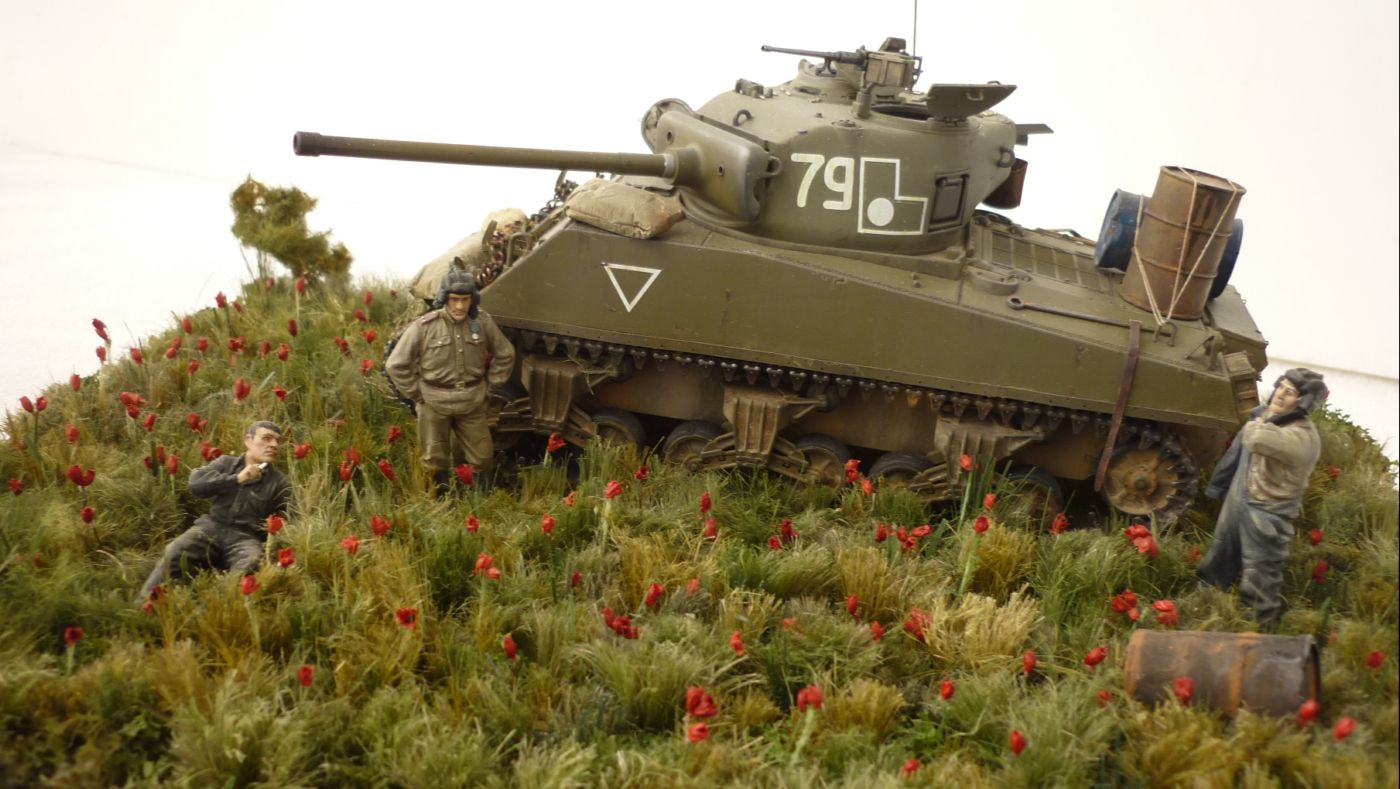 Доброе время суток коллеги! Выставляю очередную диорамку. Долго все хотел добавить цветочков, но так и не созрел, выставляю как есть.Одна из фото спровоцировала сделать эту диораму, долго не решался её сделать, но нашел подходящее растение под маки и вот что получилось судить вам!Трава сан тех лён, маки из не знаю как называется растение. Краски тамия, пигменты от миг, мешки ящик само дел На шермане после покраски увидал в каком то журнале что надо шпаклевать люк на башне, но переделывать не стал, оставил.Приятного просмотра!Спасибо за внимание!