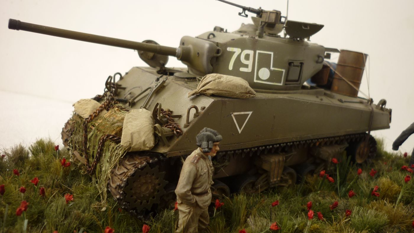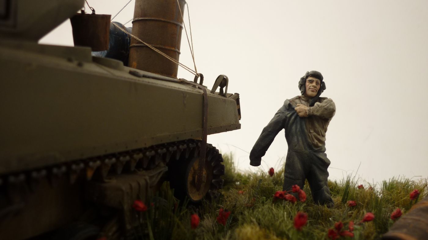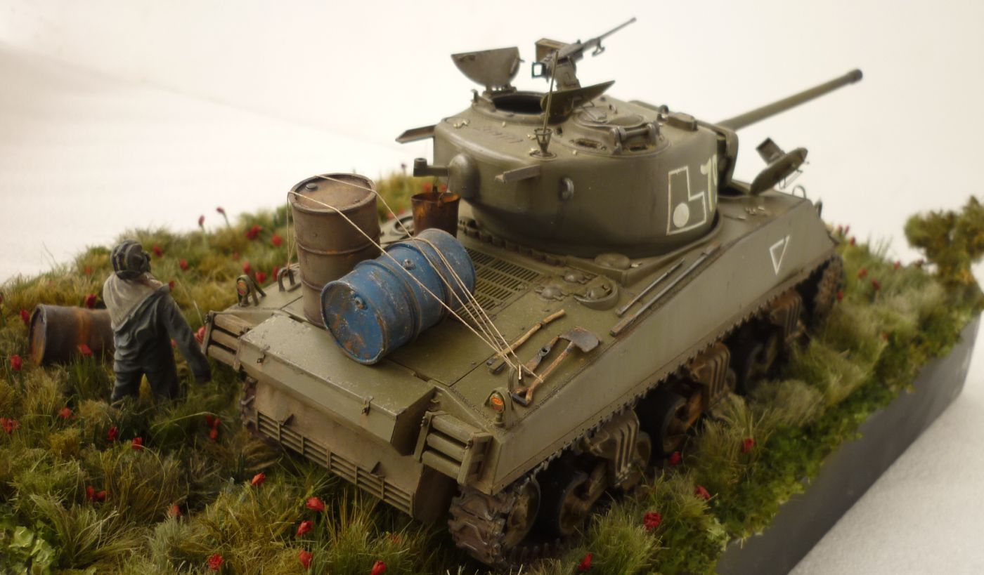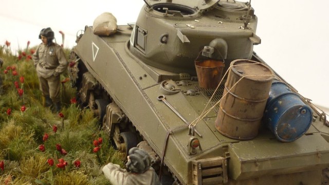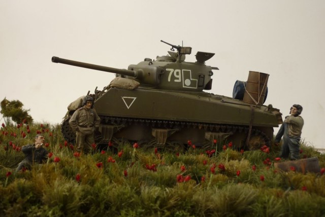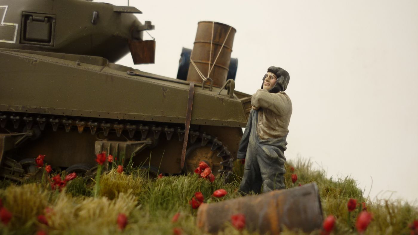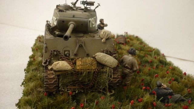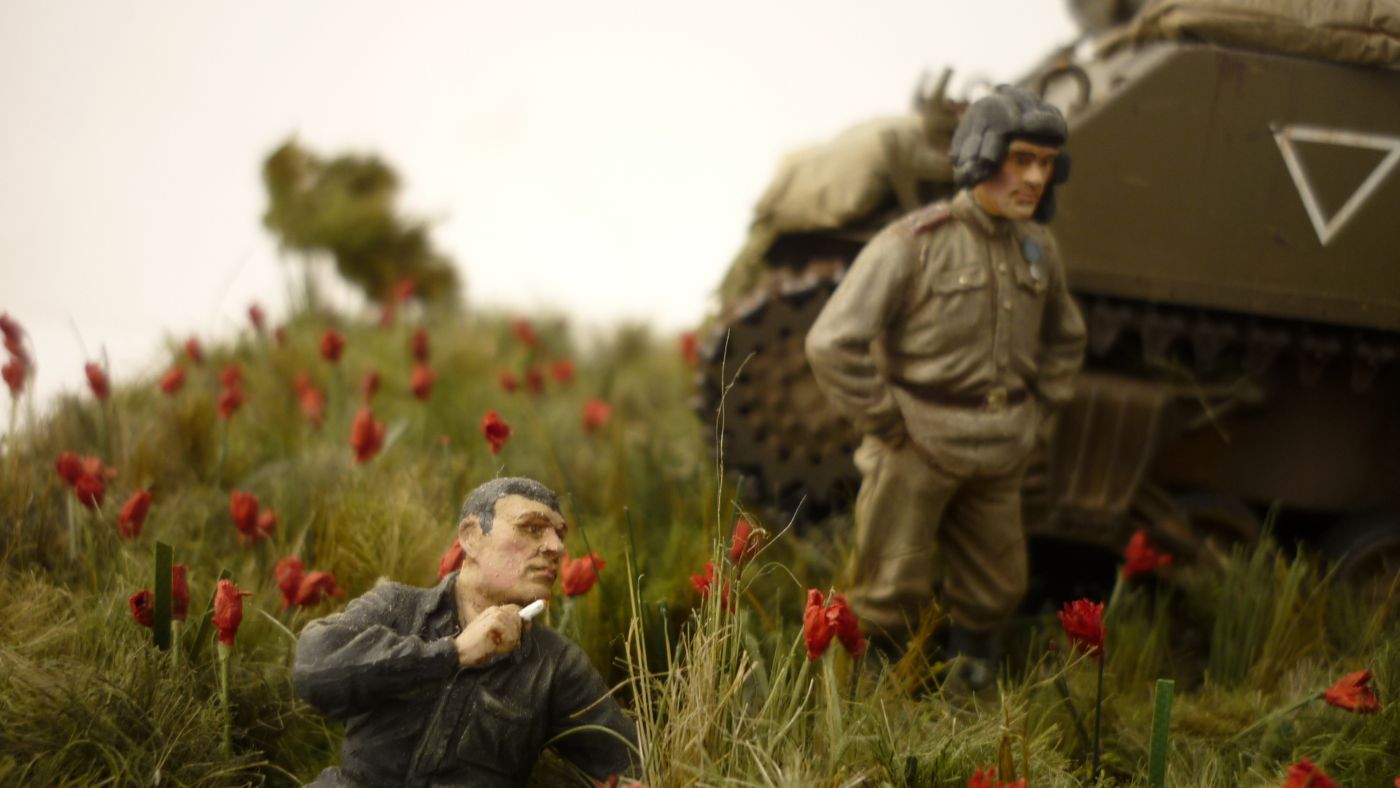 Доброе время суток коллеги! Выставляю очередную диорамку. Долго все хотел добавить цветочков, но так и не созрел, выставляю как есть.Одна из фото спровоцировала сделать эту диораму, долго не решался её сделать, но нашел подходящее растение под маки и вот что получилось судить вам!Трава сан тех лён, маки из не знаю как называется растение. Краски тамия, пигменты от миг, мешки ящик само дел На шермане после покраски увидал в каком то журнале что надо шпаклевать люк на башне, но переделывать не стал, оставил.Приятного просмотра!Спасибо за внимание!