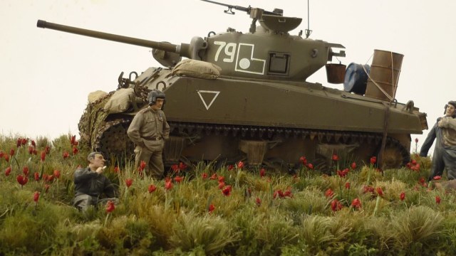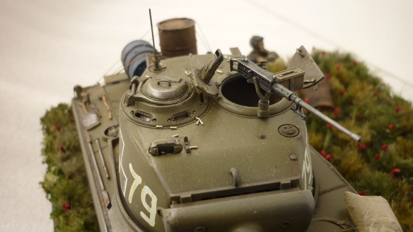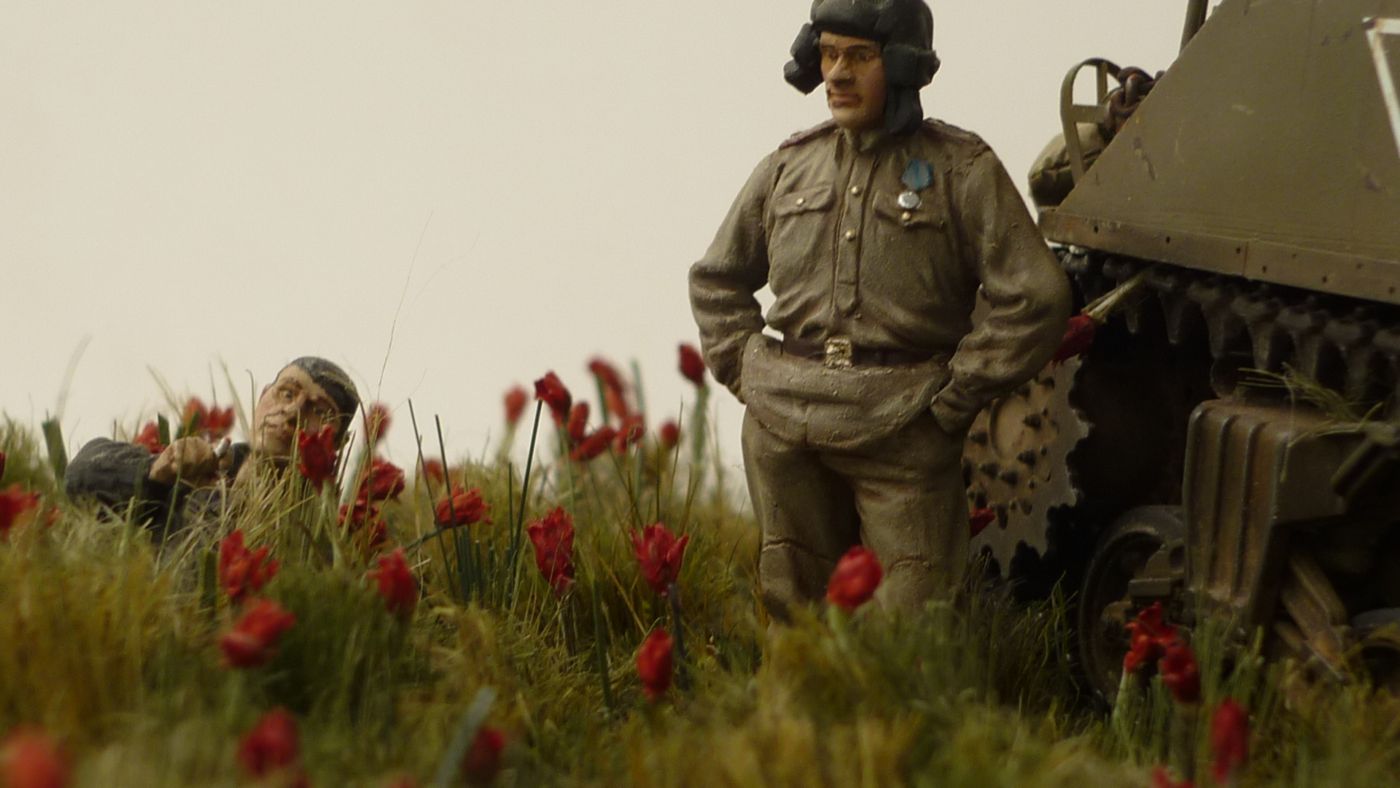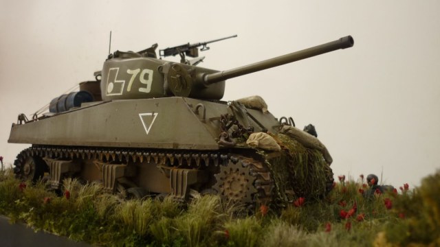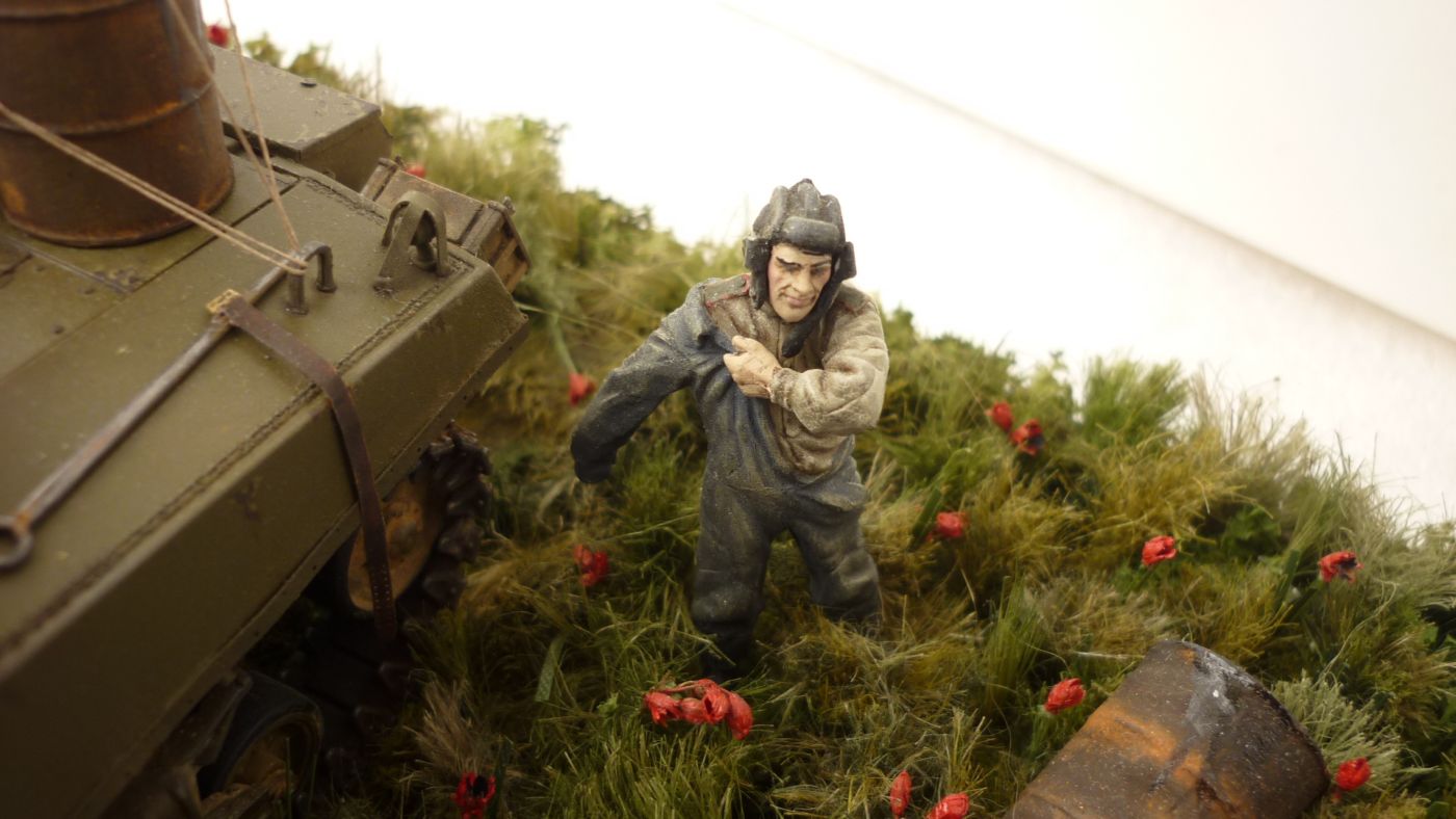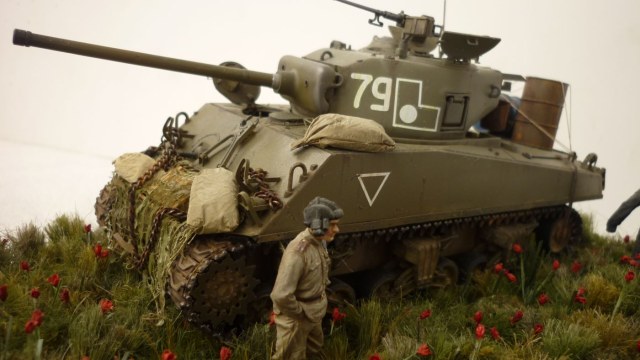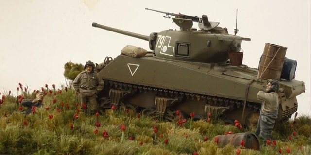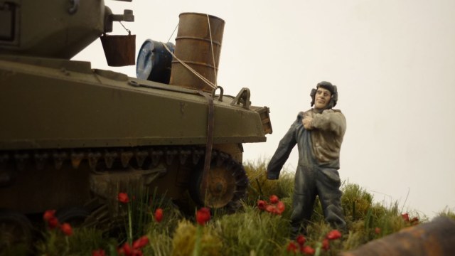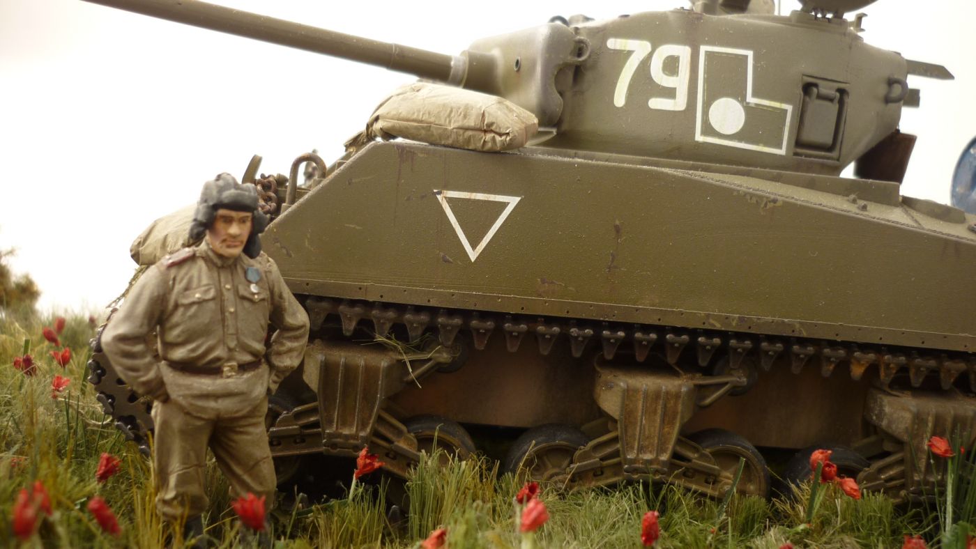 Доброе время суток коллеги! Выставляю очередную диорамку. Долго все хотел добавить цветочков, но так и не созрел, выставляю как есть.Одна из фото спровоцировала сделать эту диораму, долго не решался её сделать, но нашел подходящее растение под маки и вот что получилось судить вам!Трава сан тех лён, маки из не знаю как называется растение. Краски тамия, пигменты от миг, мешки ящик само дел На шермане после покраски увидал в каком то журнале что надо шпаклевать люк на башне, но переделывать не стал, оставил.Приятного просмотра!Спасибо за внимание!