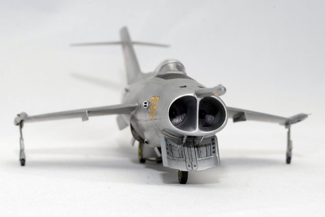 Модель представляет собой типичную ЛНД-модель уровня современного Amodel, т.е. довольно аккуратное литье, без облоя с незначительными утяжинами. Собирать планировал "из коробки", единственное что смущало- канал воздухозаборников (ВЗ). Производитель модели предлагает сделать этот узел абсолютно пустым с просвечивающейся насквозь нишей газоотражающего фартука. Я решил не идти на поводу у производителя и постараться приблизить эту часть к прототипу. Для этого фюзеляжа был разрезан поперек в районе передней стойки шасси, далее с помощью полистирола и двухкомпонентной смолы были сформирован каналы ВЗ. После придания им желаемой формы каналы были окрашены, с тыльной стороны были приклеены лопатки компрессоров двигателей, которые тоже предварительно окрасил. Далее вся носовая часть с новыми каналами ВЗ была приклеена обратно к фюзеляжу, стык обработан и восстановлена расшивка. Кроме того были заново изготовлены мелкие воздухозаборники размещенные по всему фюзеляжу.