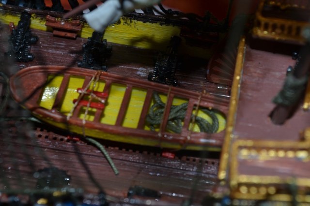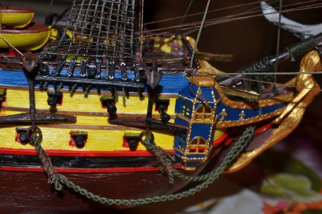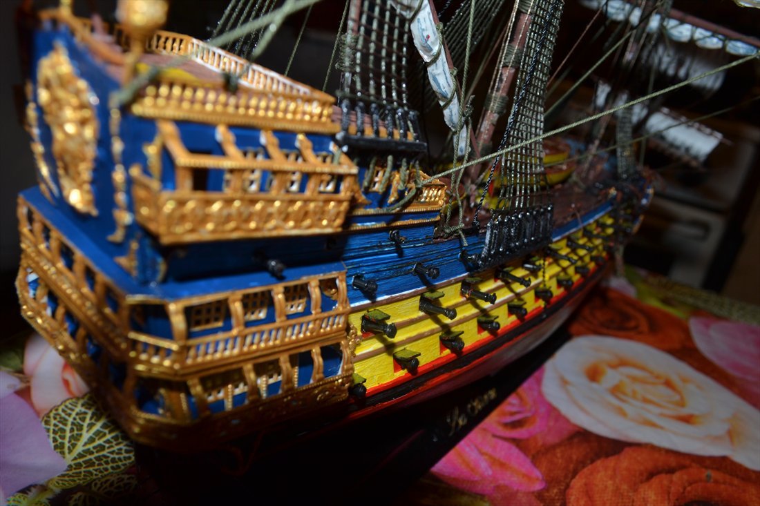 Даже не знаю с чего начать. Вроде бы и работа проделана, и душа вложена ( парусник собрать, с такелажем, без души- не получится). А конечный результат не очень смотрится. Слишком яркая окраска ( много жёлтого) и подбор красок неудачный. Расположение пушек вызывает удивление. На корабль установили пушки Кане? Стволы выглядывают из портов по самые цапфы. Подборка фотографий нарочно поазывает не лучшие виды. Описание скромно умалчивает что же подверглось авторской доработке.