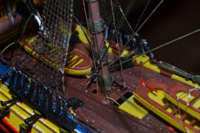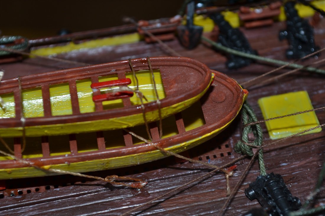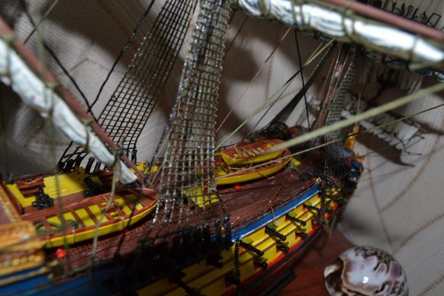 Что касается доработок...им подвергаются(хотя бы минимальным) думаю 99 процентов всех моделей парусников.Сам по себе корабль прекрасен.Я бы себе такой в коллекцию заимел.Производитель "моделист"(см.фото).По ошибкам сказать мало что можно, из-за фото сессии которая не в дугу. Что бросается в глаза так это, что автор подошел к исполнению такелажа с серьезностью(обвязаны даже шлюпки), но полной картины не видно.Что плохо: кривые ванты, лафеты пушек в один цвет с самими пушками, необработанные стыки пресс форм (рея на фото1), паруса без тонировки(что в общем и не страшно) и очень, очень много глянцевого лака. Палубу и шлюпки точно не надо было глянцем покрывать. Пока к сожалению песок. С уважением.