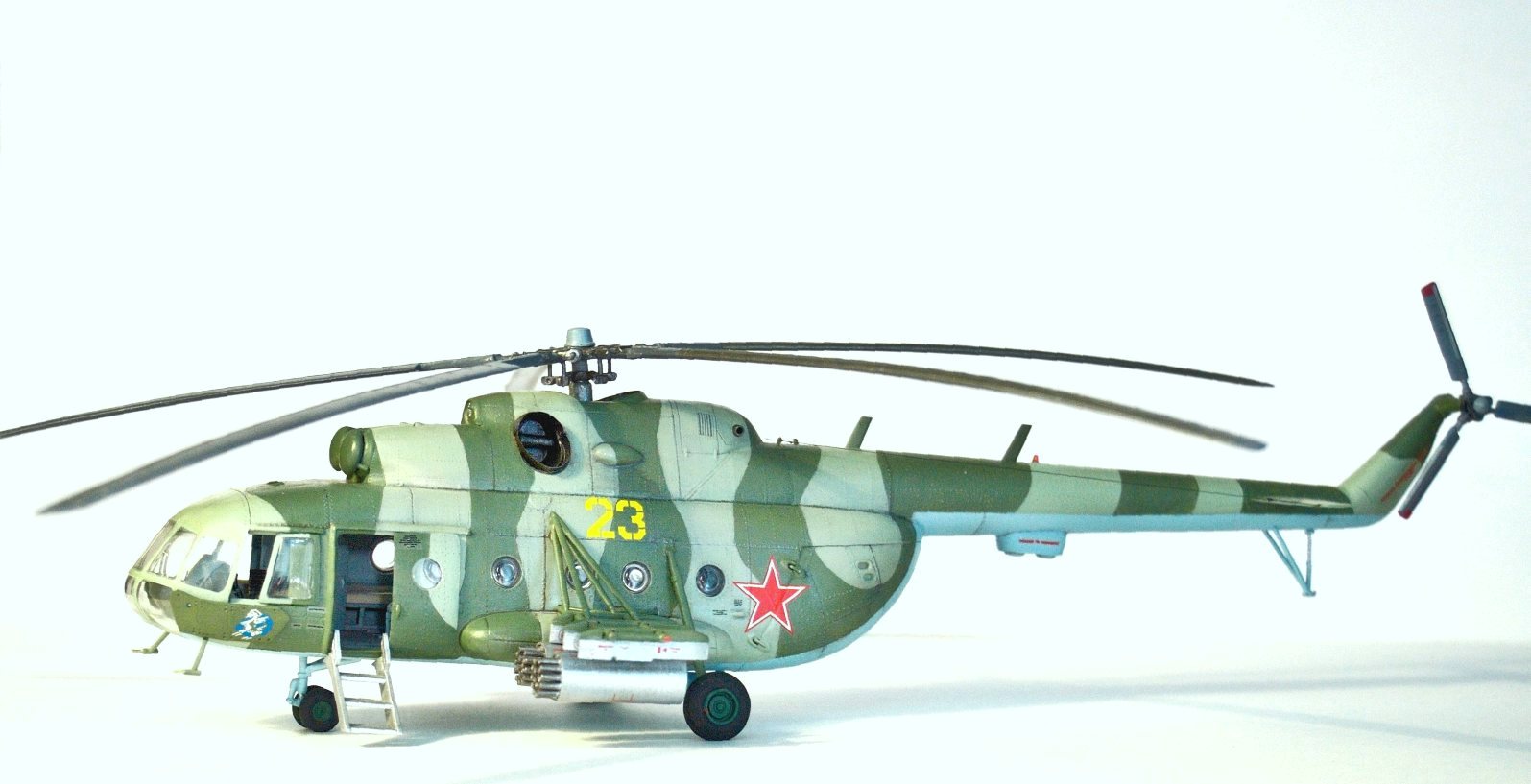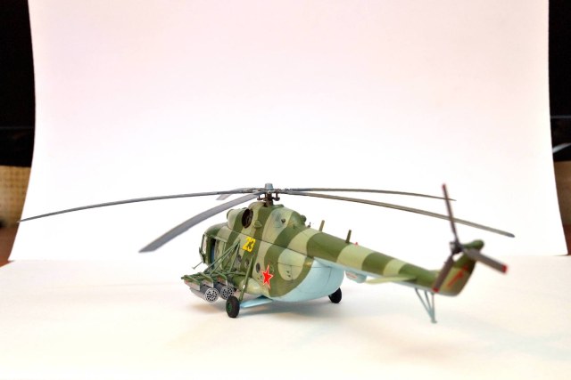 Добрый день! Представляю вам модель вертолёта Ми-8мт(Ми-17) от Звезды, 23 борт 262-й Баграмской вертолётной эскадрильи. Модель можно назвать незавершённой, к сожалению сейчас и какое то время в будущем, не будет возможности заниматься моделями, и пока она не собрала всю пыль, решил сфотографировать.