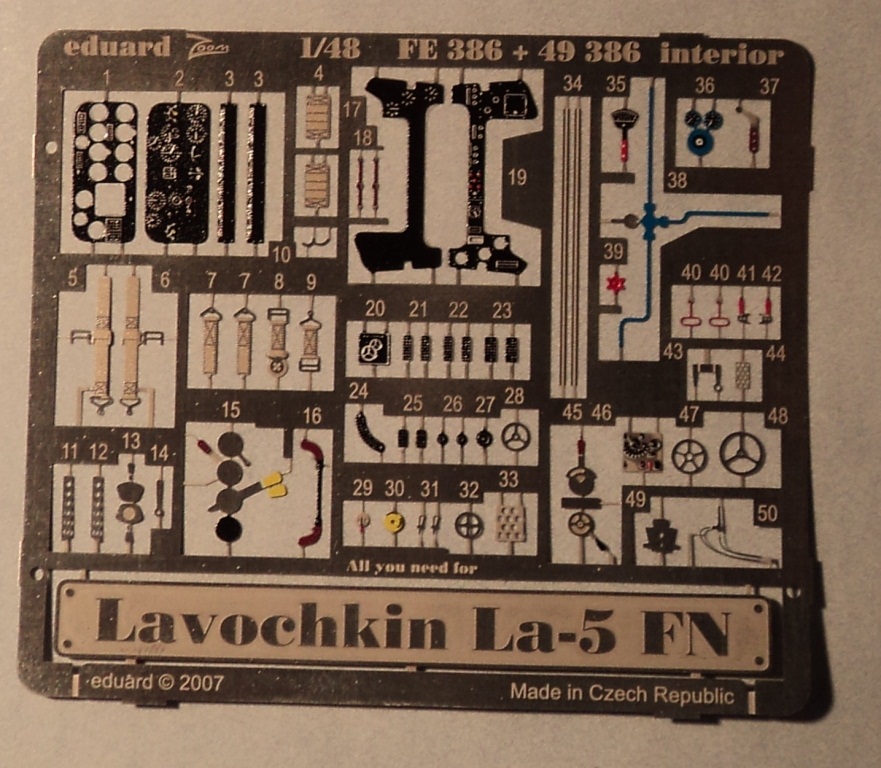 На сей раз это Цветное самоклеющееся фототравление от "Эдуарда" для модели Ла-5ФН фирмы "Звезда". В наборе инструкция на английском языке, что не сделало ее непонятной. Из недочетов - черная приборная панель (на Ла-5ФН вроде как еще была цвета А-14, хотя в вопрос еще не углублялся, возможно и были варианты. А так же шланг голубого цвета - ошибка. Если честно, не помню его применение, но цвет у него был не голубой, недавно на эту тему натыкался на "скалке".