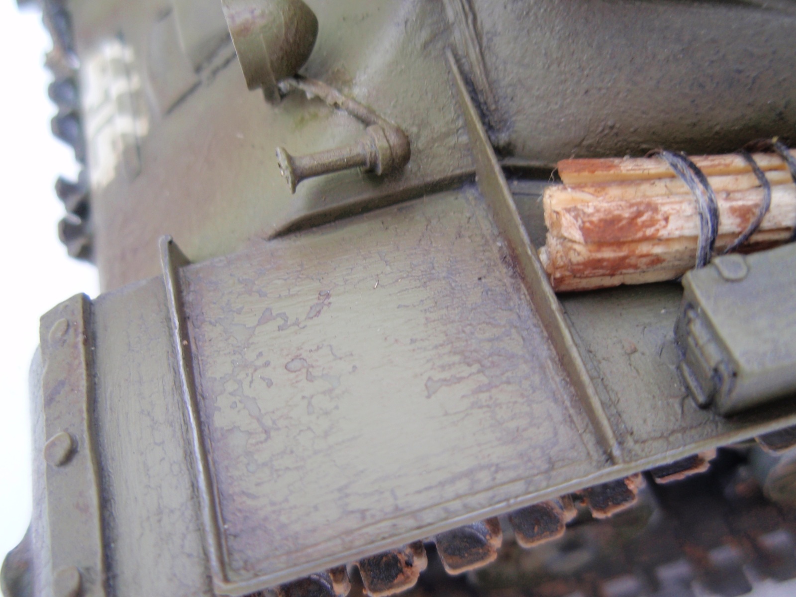 2)После доработки. Была проведена проводка к фаре и клаксону. Нанес самодельные фильтры. Симитировал лущение краски с помощью нанесения на неё уайт спирита. Сделал потёртости на катках. Нанес самодельную смывку, маслянные точки. Сколы делал маслом "санет". Добавил самодельный инструмент сз фальги и проволоки (прошу оценить его отдельно). Хотелось сделать поюзаный пехотный танчег) Добавил всякое барахлишко для зрелещьности. Нарыл в закромах касету для ДШК. Бревно- это предмет моего вандализма во дворе дома.