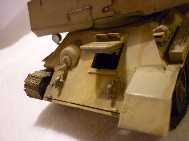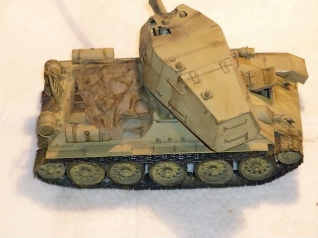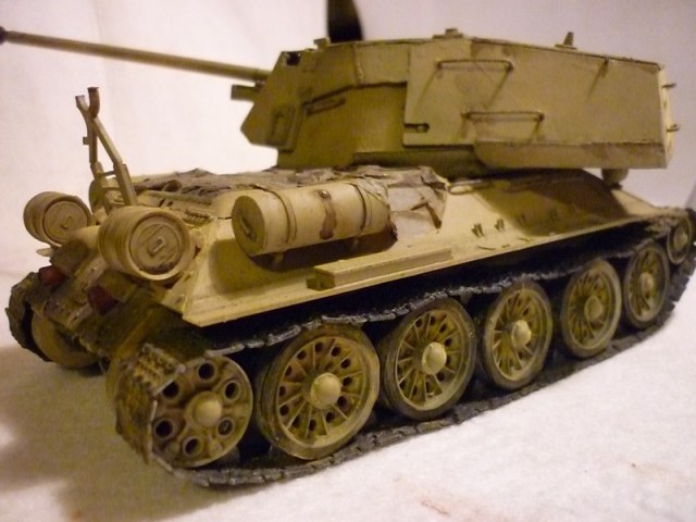 Выношу на ваш суд первую модель с подобного рода конверсиями. За прообраз взята египетская ПТСАУ на базе Т34, которые на момент поставки уже были морально устаревшими. Поэтому хитрозадые ебиптяне переделали их под пушку БС3. Для этого пришлось нарастить башню и перевернуть оную задом наперёд. В своеё модели использовал корпус от Макета (зарёкся покупать что то чисто макетовское) В катках пришлось просверливать заново все отверстия и наращивать обода с помощью дошеракпластика. Всё в облое и в утяжинах :( Башня взята Звёздовская и добавлены листы из пластиковой доски для лепки пластилина. Ствол самодельный. Запилил место мехвода (сиденье и рычаги) но не могу сфоткать (фотограф я савсем не айс). Окрашивалось акрилами Звезда, Акан. Смывка масло Сонет. Пылил тёртой пастелью. Брезент- ПВА и обёрточная бумага. Масксеть из бинта. Планирую поставить на диораму. Отправляю модель в песок ибо тут матчастью и не пахнет. К табуретам готов - ибо невпервой)))