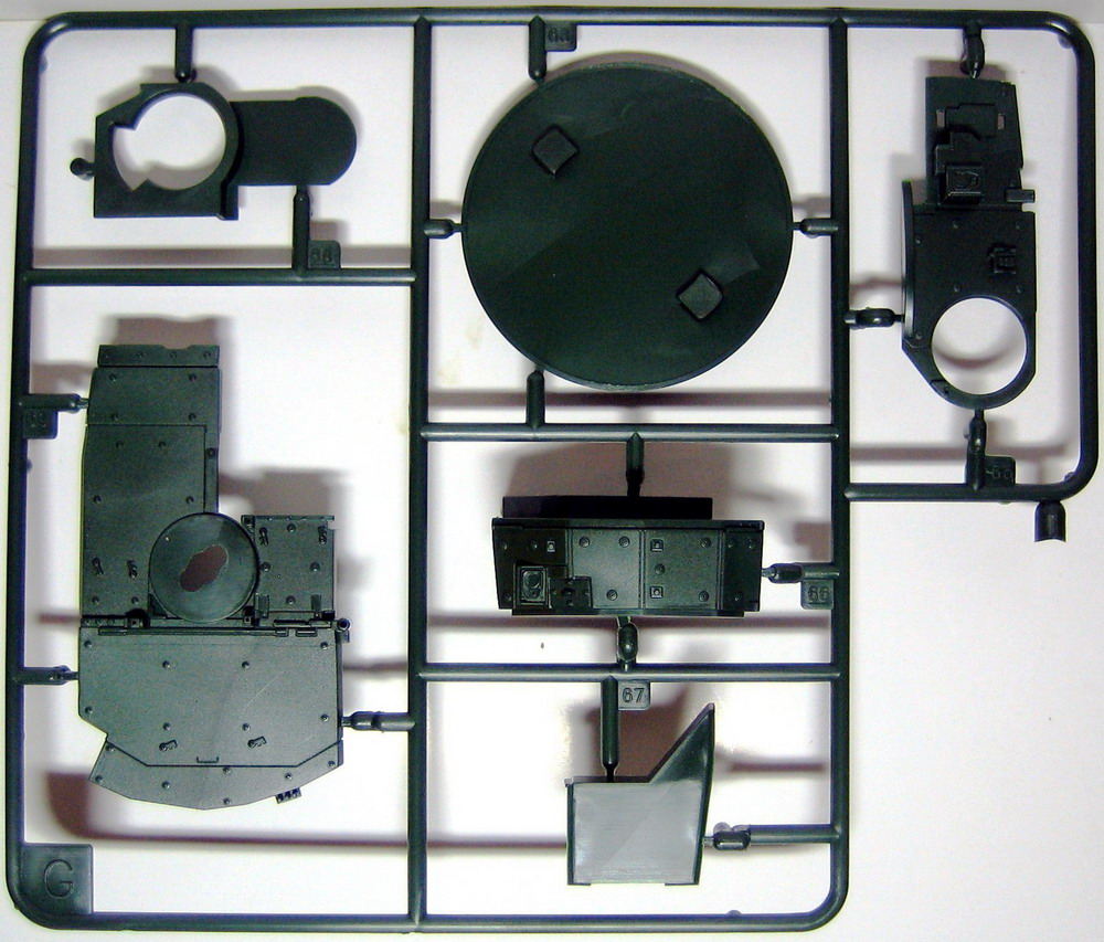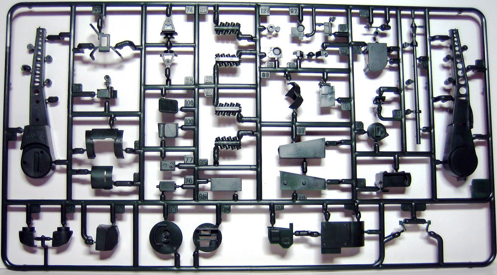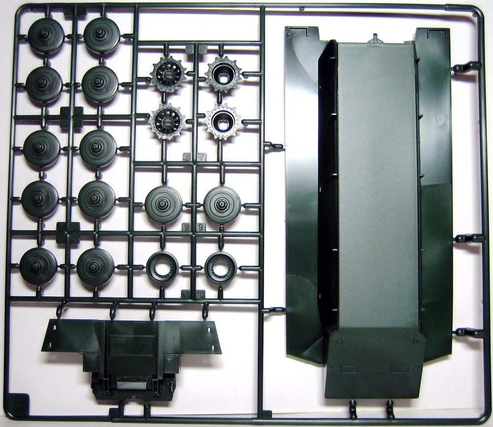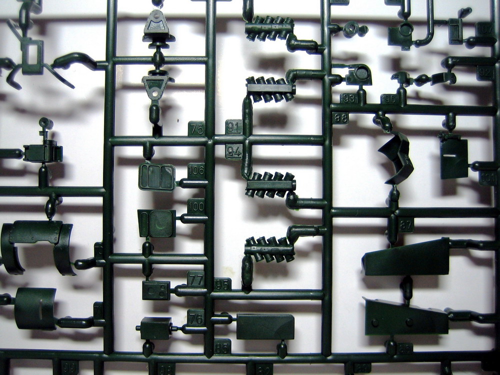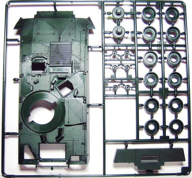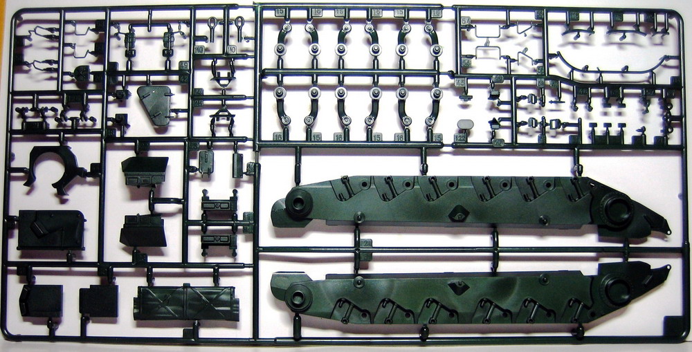 Ну а теперь непосредственно о наборе. В коробке с ярким рисунком прототипа находятся 8 литников полистирола темно-зеленого цвета. Складывается впечатление, что пластик жирный из-за довольно сильного блеска, даже фотографировать трудновато, отсвечивает сильно. Структура отливок навевает мысли о том, что в ходе процесса отливок деталей у производителя постоянно заканчивается пластик, и его постоянно доливают в пресс-форму. Местами имеется облой, кое-где мелкие утяжинки. На вентиляционной решетке в районе люка мехвода в моем случае есть недоливы некоторых сегментов, что не особо радует. Любовью к излишней деталировке Ревелл никогда не страдал, поэтому многие мелкие детали отлиты заодно с более крупными, что реализма модели не придаст. Стандартные «слепые» смотровые приборы лишь имитируют триплексы. Для того, чтобы вставить в них стекла, придется вырезать посадочные места, либо тупо имитировать лаком. Детали подвески отлиты заодно с боковыми сегментами ванны, но балансиры даны отдельно. Все имеющиеся решетки глухие, т.е. лишены просветов, что тоже как-то не айс. Проработка мелких деталей уровнем выше среднего, но до эталона явно не дотягивает. Ствол орудия выполнен одной деталью, это плюс.