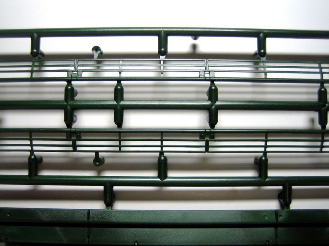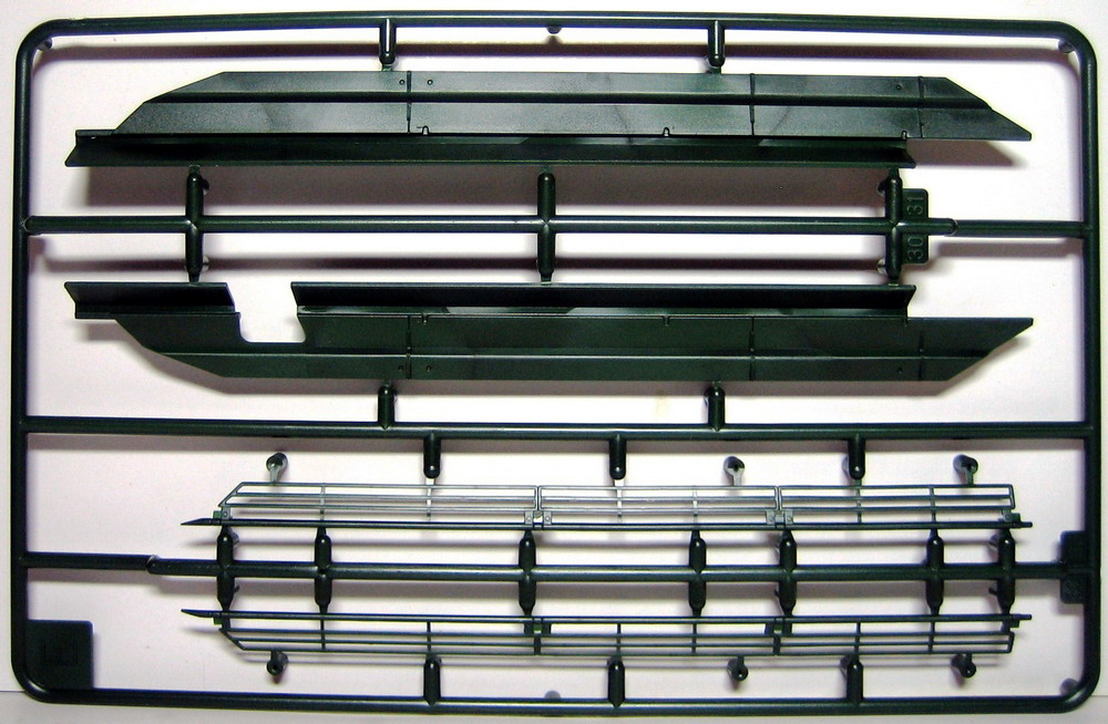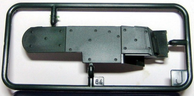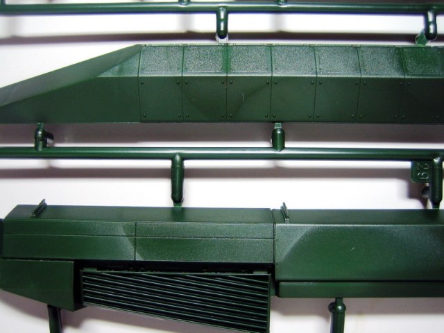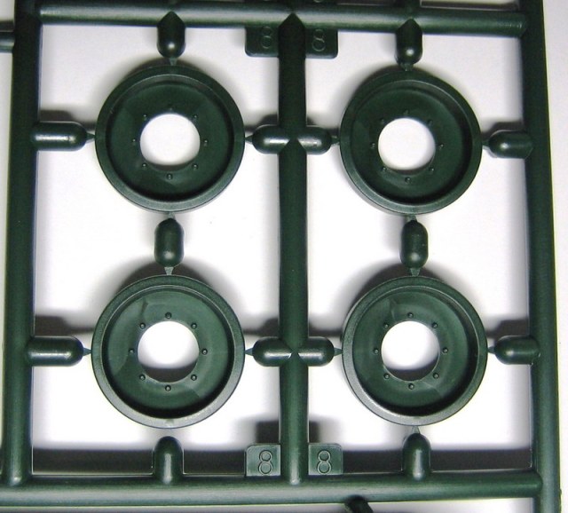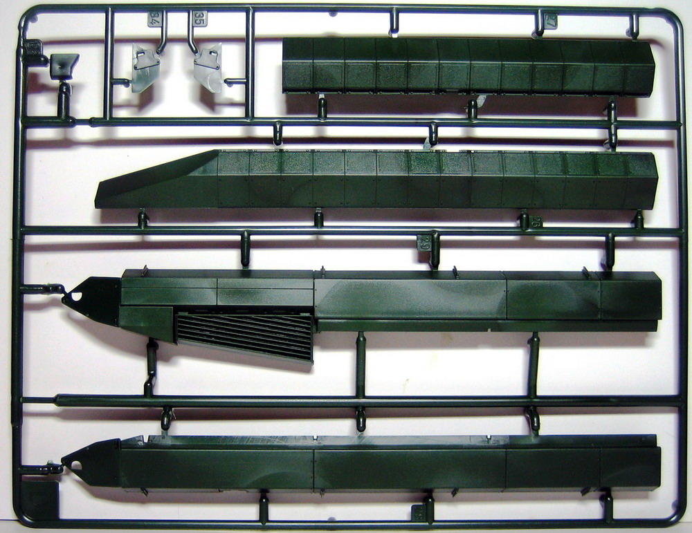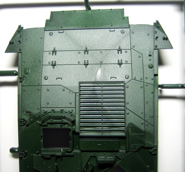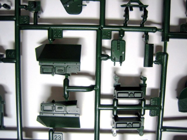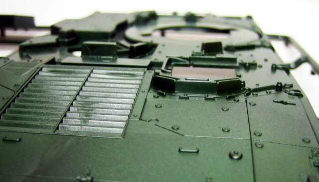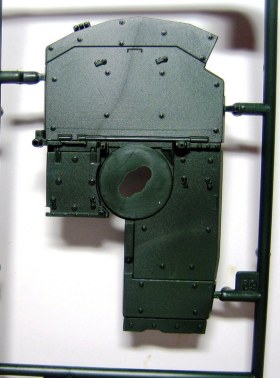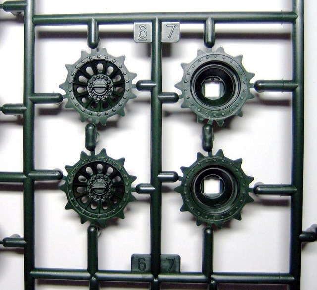 Ну а теперь непосредственно о наборе. В коробке с ярким рисунком прототипа находятся 8 литников полистирола темно-зеленого цвета. Складывается впечатление, что пластик жирный из-за довольно сильного блеска, даже фотографировать трудновато, отсвечивает сильно. Структура отливок навевает мысли о том, что в ходе процесса отливок деталей у производителя постоянно заканчивается пластик, и его постоянно доливают в пресс-форму. Местами имеется облой, кое-где мелкие утяжинки. На вентиляционной решетке в районе люка мехвода в моем случае есть недоливы некоторых сегментов, что не особо радует. Любовью к излишней деталировке Ревелл никогда не страдал, поэтому многие мелкие детали отлиты заодно с более крупными, что реализма модели не придаст. Стандартные «слепые» смотровые приборы лишь имитируют триплексы. Для того, чтобы вставить в них стекла, придется вырезать посадочные места, либо тупо имитировать лаком. Детали подвески отлиты заодно с боковыми сегментами ванны, но балансиры даны отдельно. Все имеющиеся решетки глухие, т.е. лишены просветов, что тоже как-то не айс. Проработка мелких деталей уровнем выше среднего, но до эталона явно не дотягивает. Ствол орудия выполнен одной деталью, это плюс.