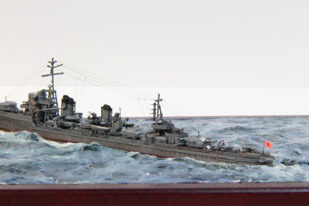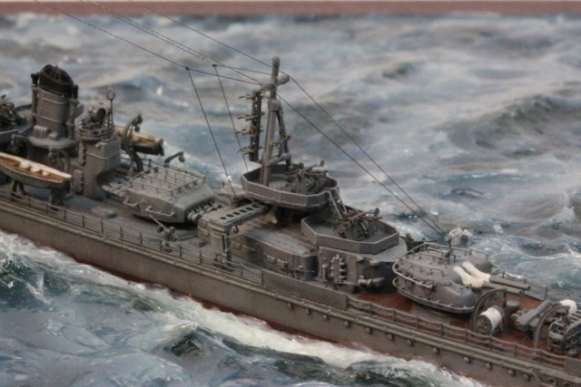 По модели замечаний нет. Все выполнено на очень хорошем уровне, аккуратный получился эсминец. Вопрос по расположению флага. На кормовом флагштоке флаг вроде вывешивается только на стоянке в базе. А в походе он должен располагаться на мачте. Или я ошибаюсь?